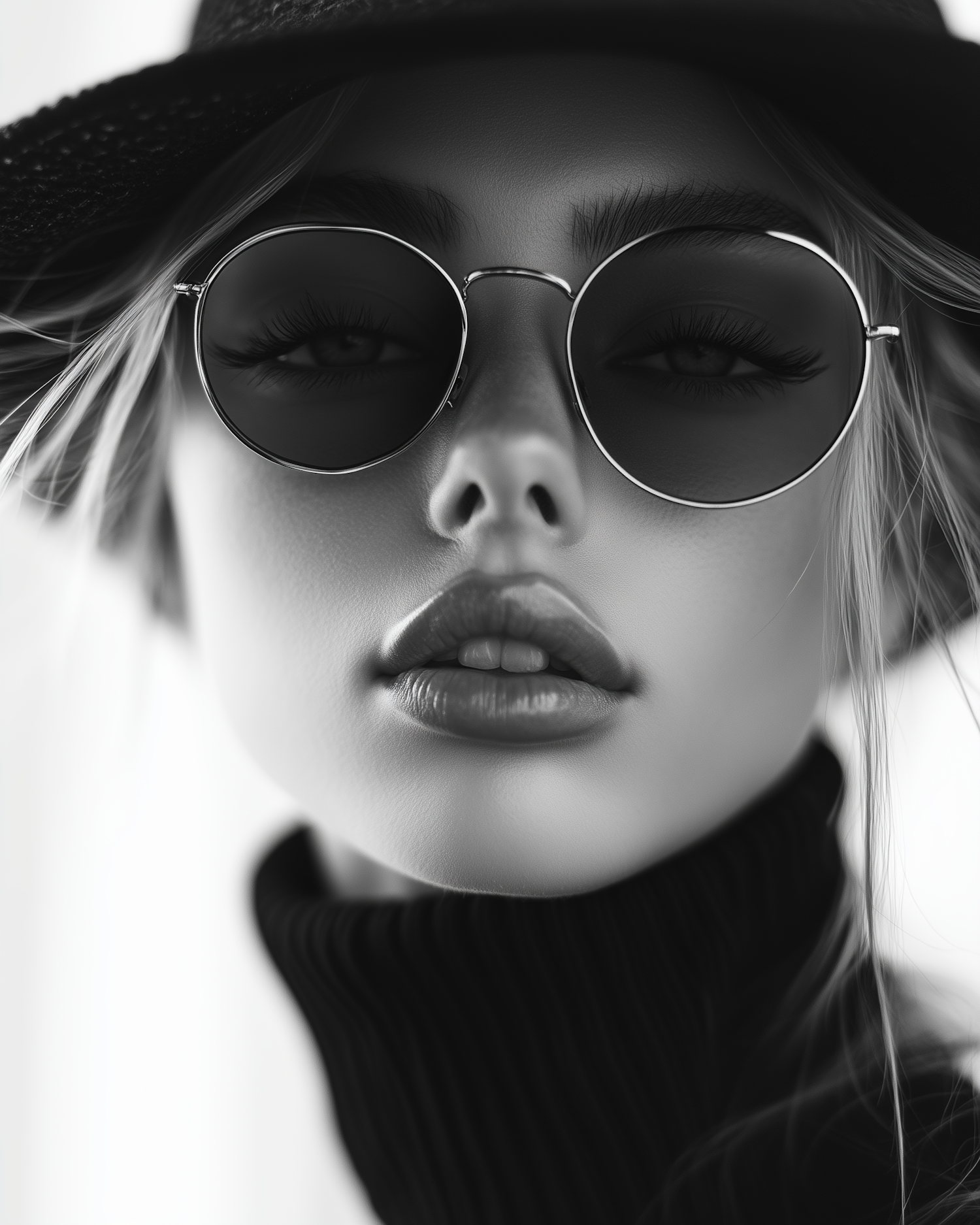 Black and white portrait of a woman in sunglasses and a hat, exuding mystery and elegance with a high-necked sweater.