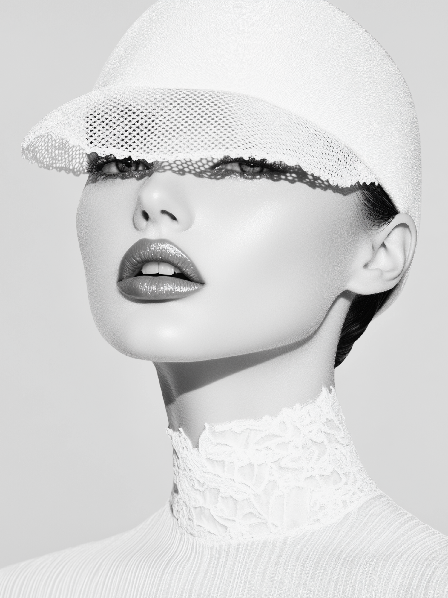 Monochromatic portrait of a woman in a white hat with lace brim, exuding elegance and mystery with glossy lips and textured attire.