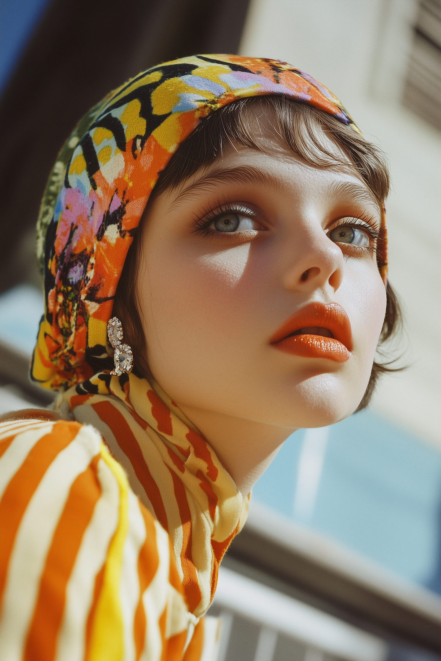 Vibrant headscarf with multicolored patterns and sparkling earrings, paired with a bold orange-striped garment in an outdoor setting.
