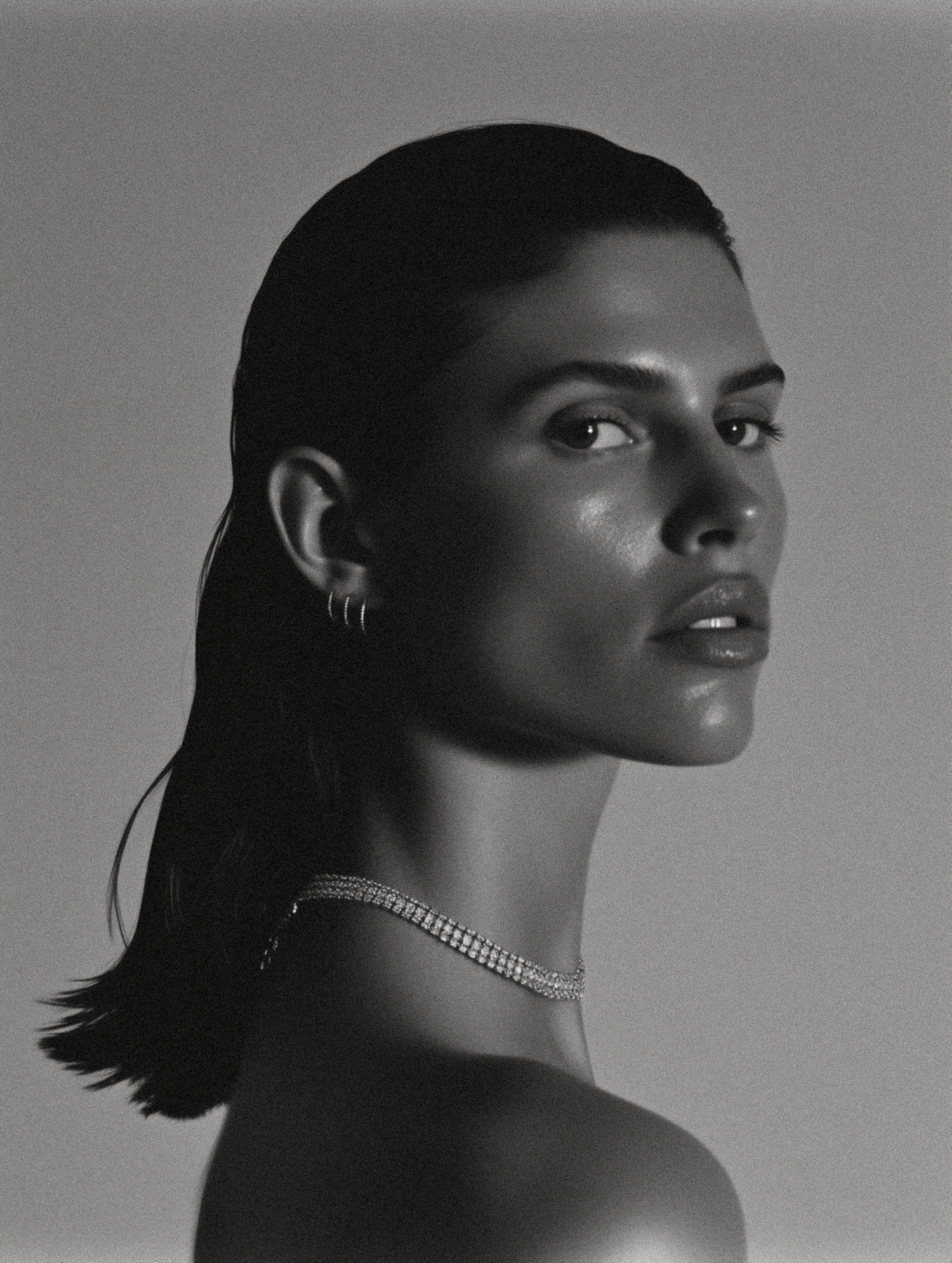 Striking black-and-white portrait of a woman with sleek hair, diamond jewelry, and a confident gaze, exuding timeless elegance.