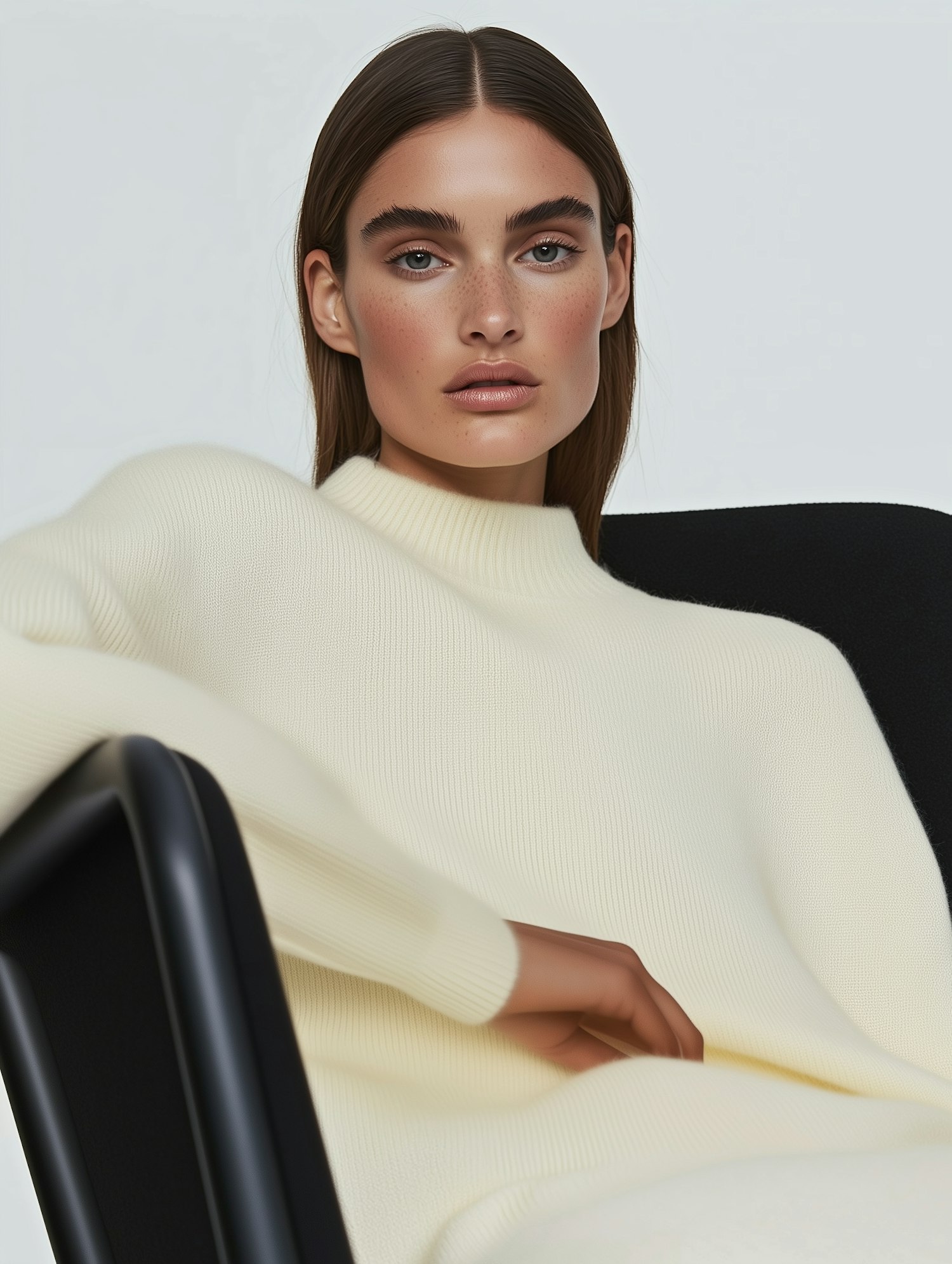 A serene portrait of a woman in a cream knit sweater, sitting on a black chair with a minimalistic background.