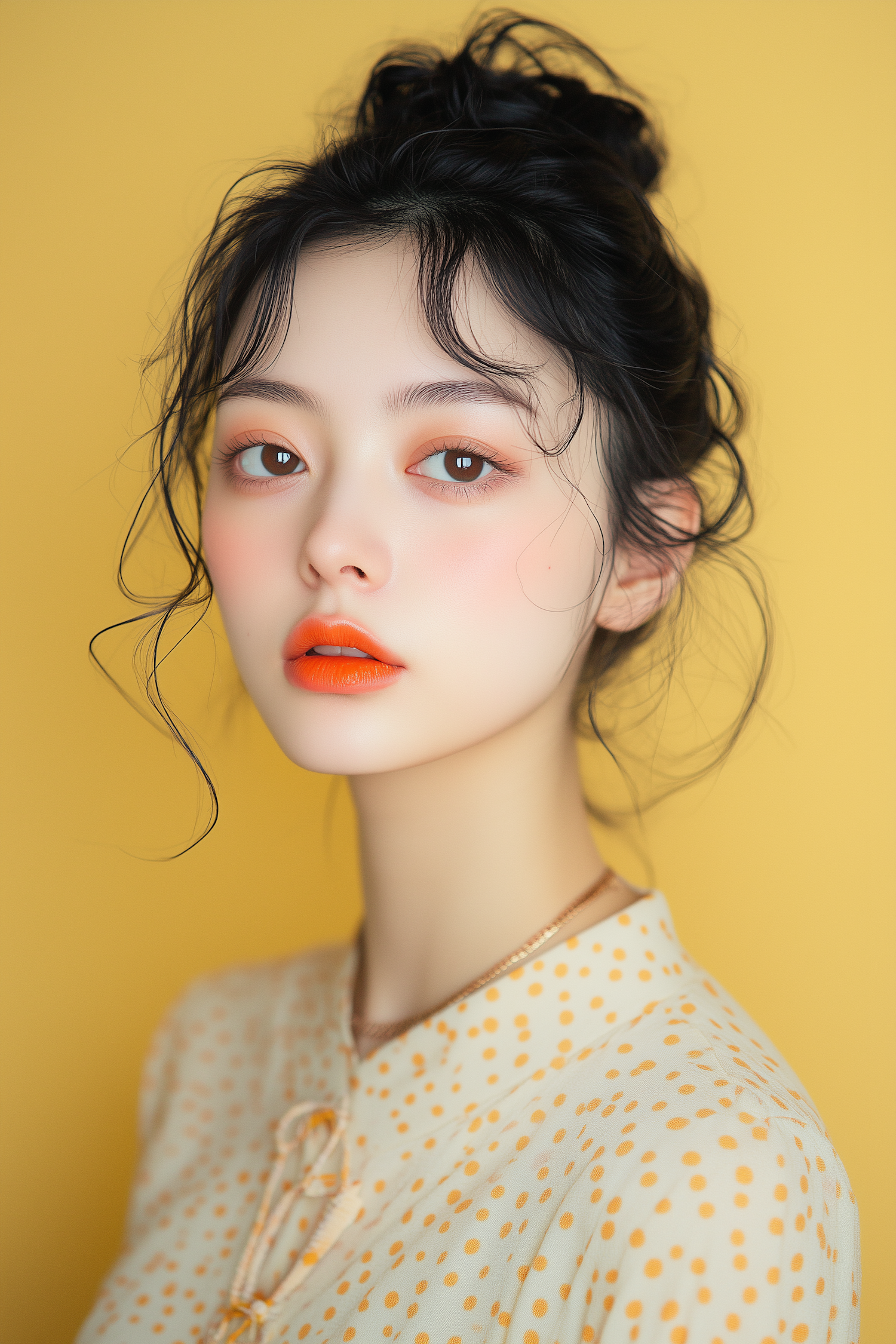 Portrait of a young woman with orange makeup, polka dot blouse, and a yellow background. Vibrant and stylish aesthetic.