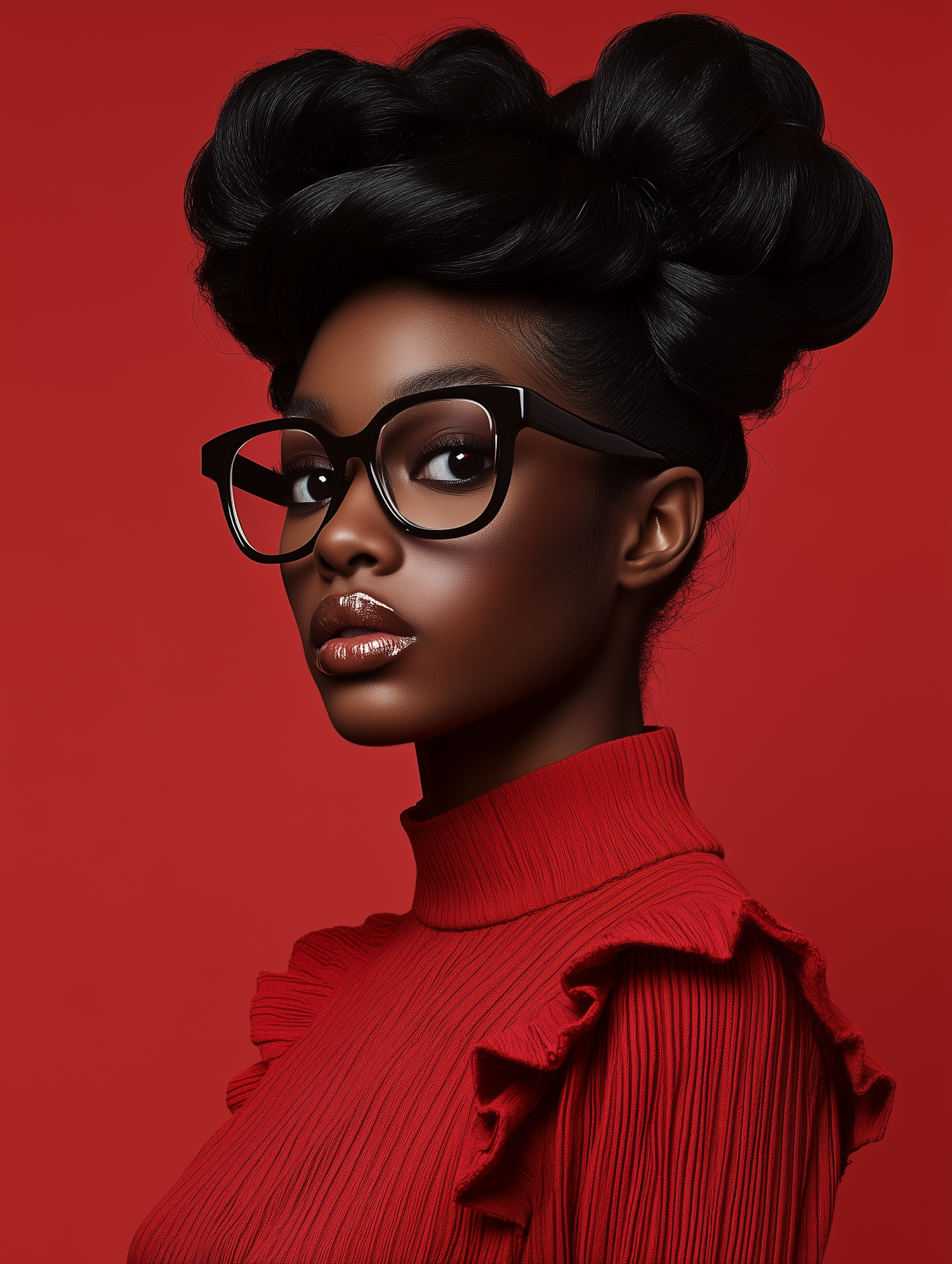 Elegant portrait of a woman with bold glasses, intricate updo, and a red textured top against a vibrant red background.