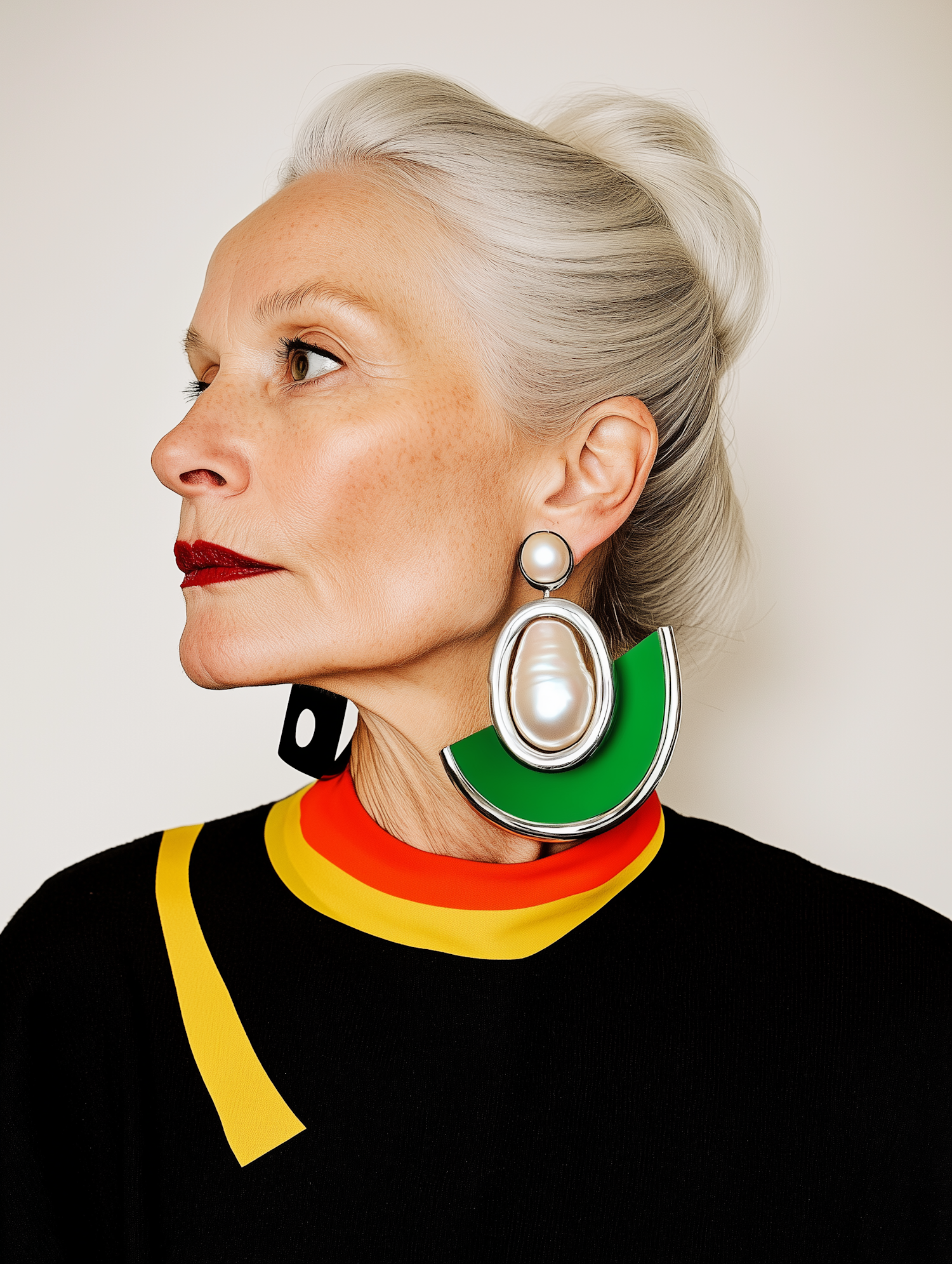 Elegant older woman with silver hair, bold green earrings, and red lipstick in a modern black outfit with colorful accents.