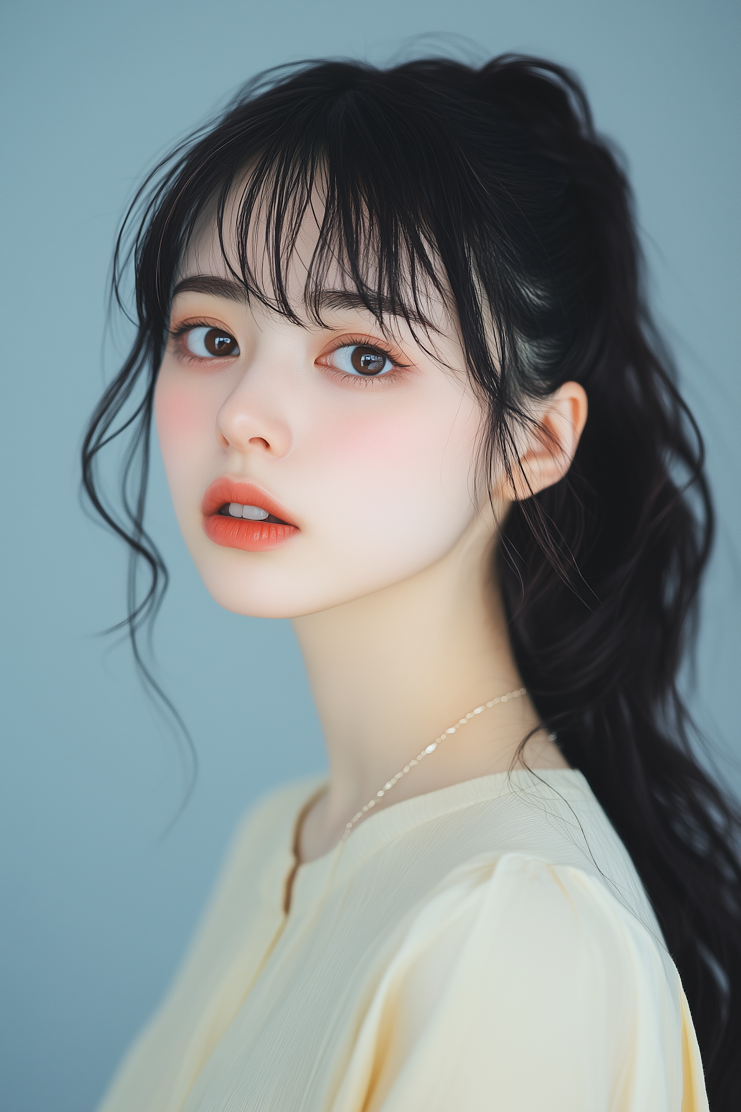 Portrait of a young woman with wavy dark hair, soft makeup, and a light yellow blouse against a muted blue background.