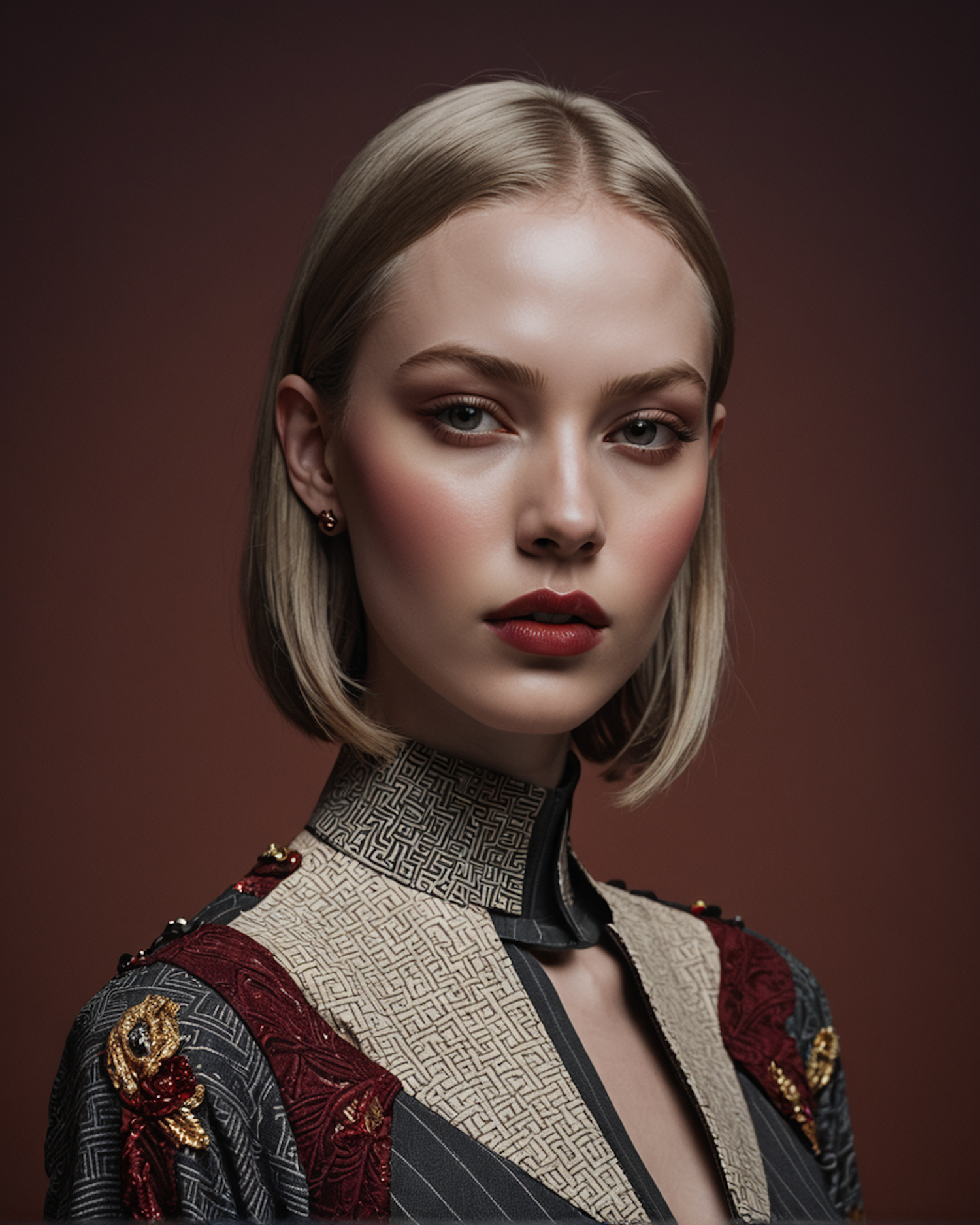 Elegant portrait of a blonde woman in a detailed high-collared outfit with red and gold accents, set against a warm brown background.
