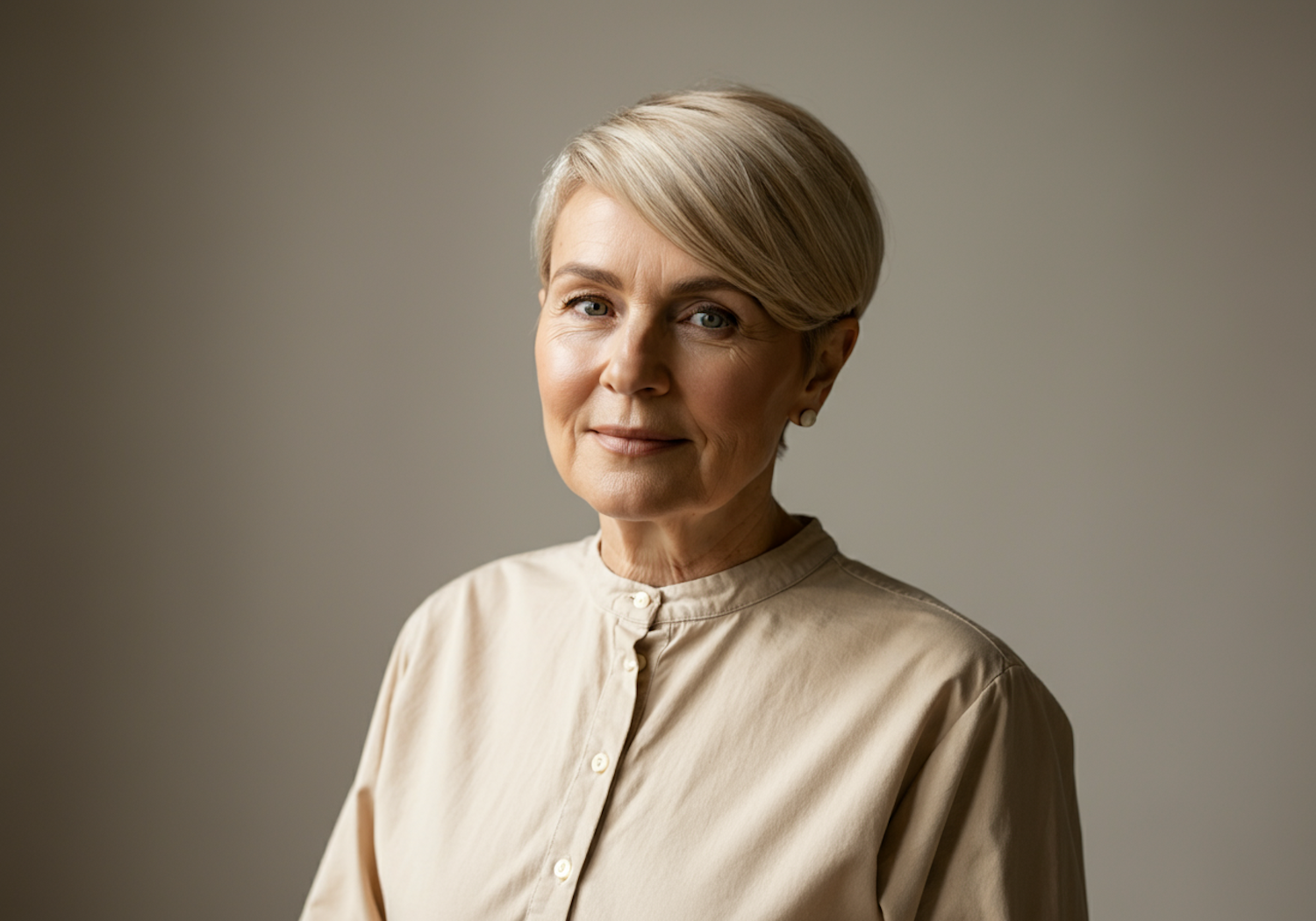 Portrait of a middle-aged woman with short blonde hair, wearing a beige shirt, set against a neutral gray background.