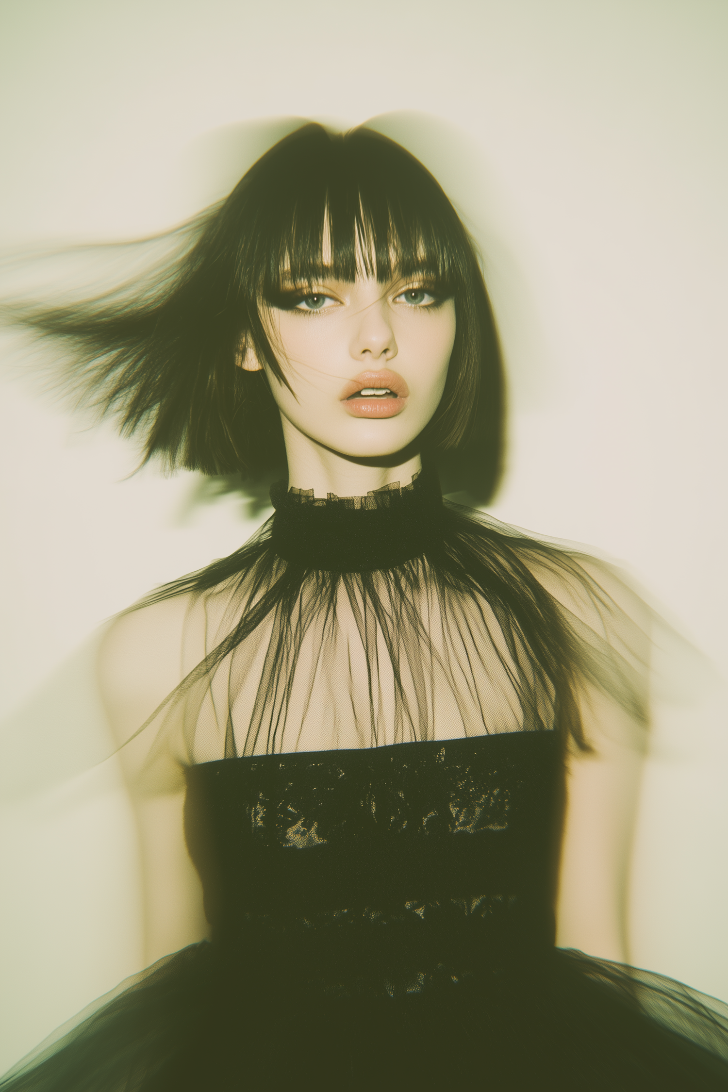A striking portrait of a woman with short dark hair, green eyes, and a black tulle dress, set against a soft greenish background.