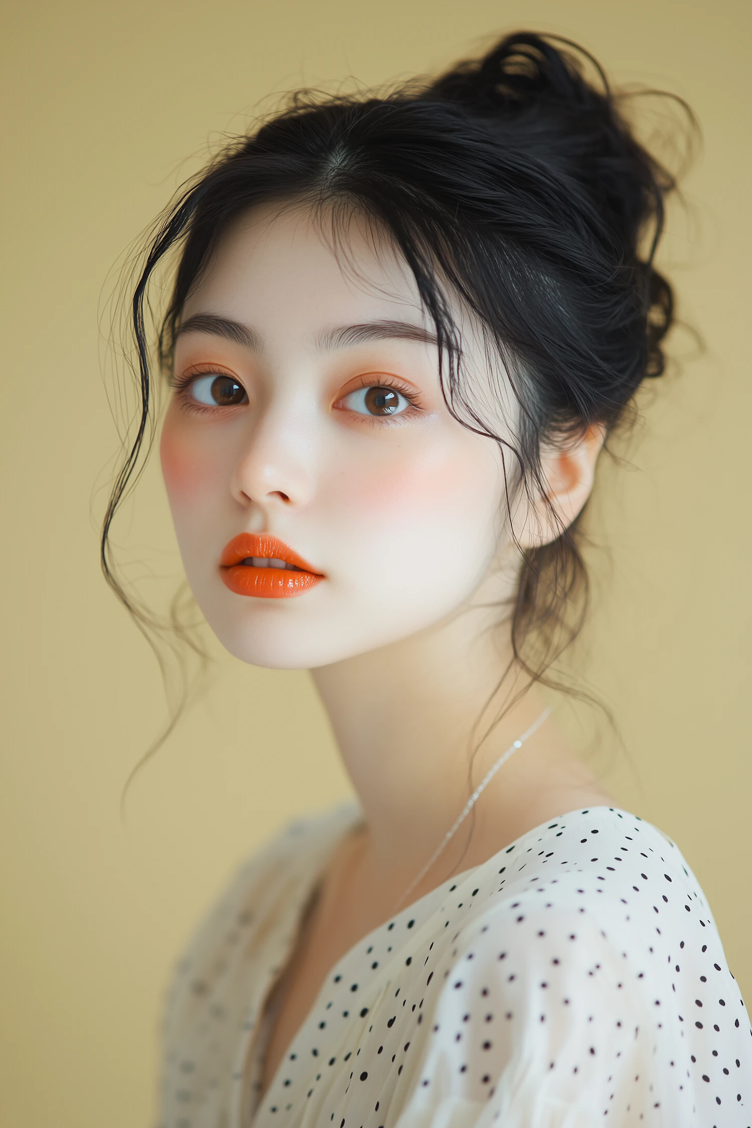 Elegant portrait of a young woman with glossy orange lips, polka dot blouse, and a soft yellow background.