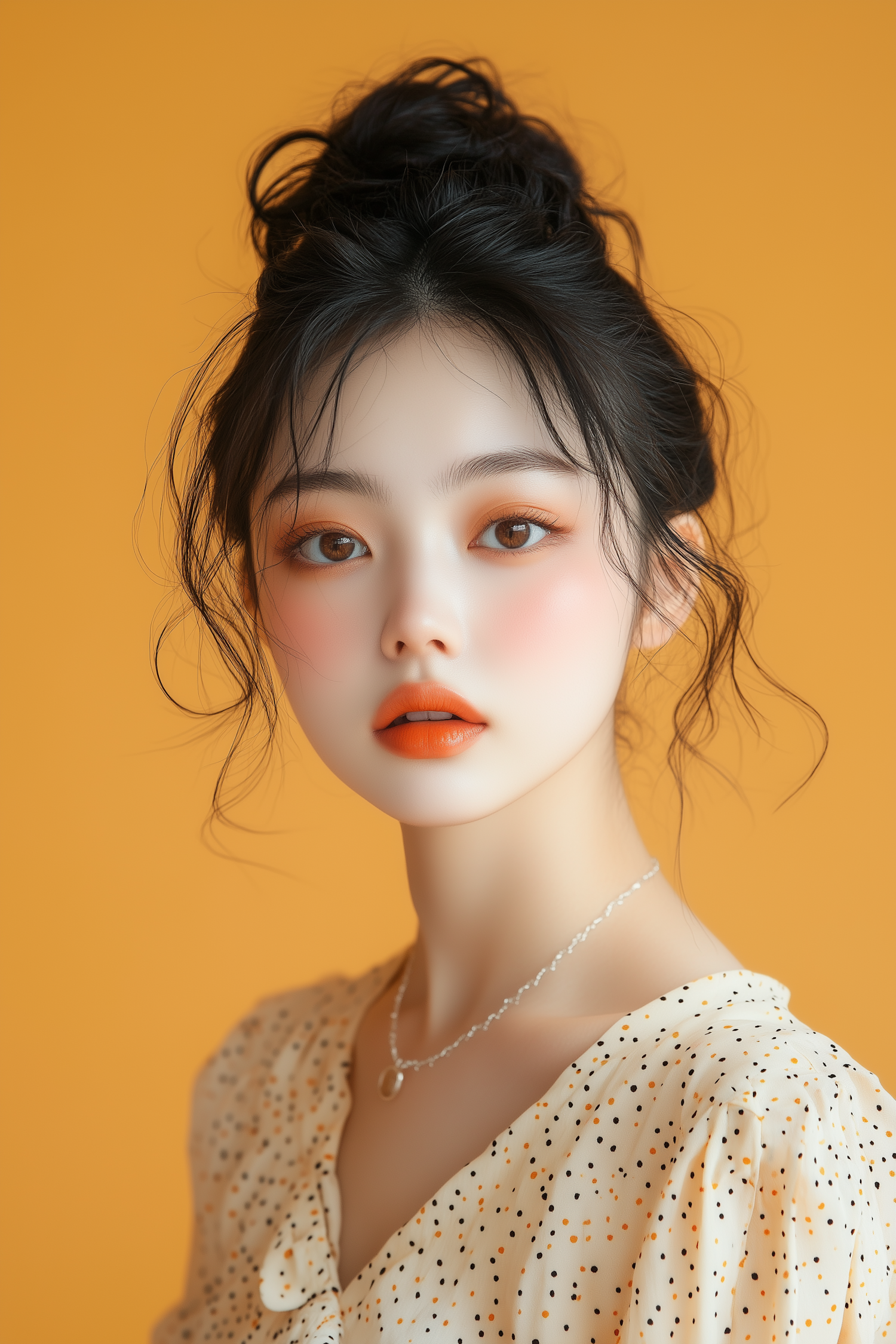 Elegant portrait of a young woman with orange makeup, polka dot blouse, and a warm orange background. Perfect for beauty and fashion inspiration.