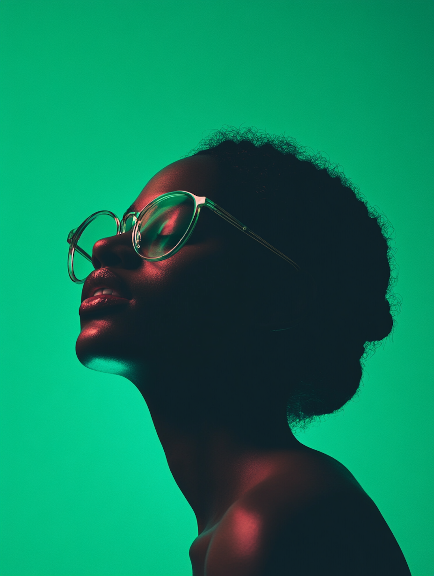 A bold portrait of a woman with glasses, glowing under dramatic lighting with a green background and red highlights.
