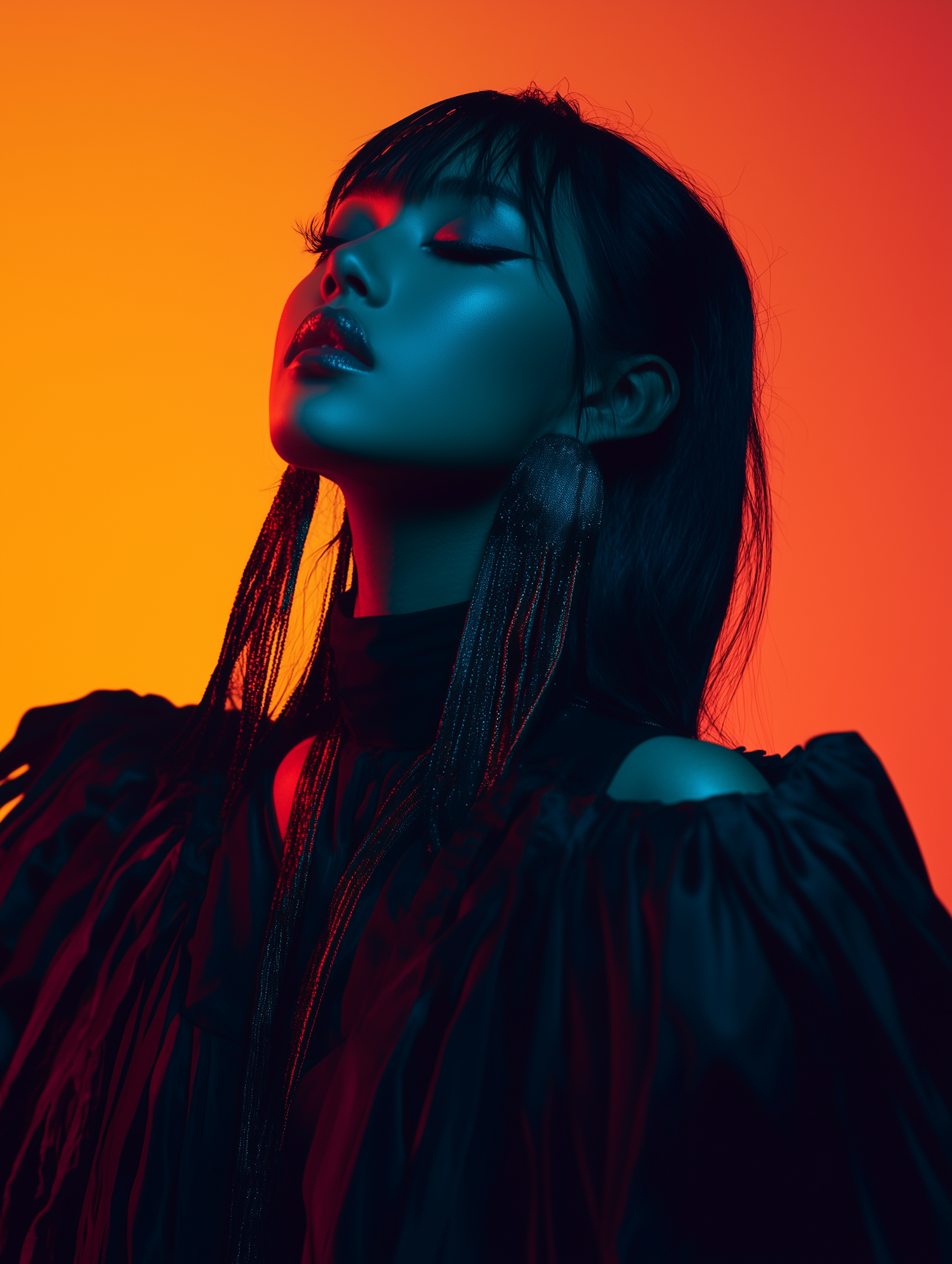A bold portrait of a woman with teal-toned skin, dramatic lighting, and a vibrant orange-red background. Striking earrings and makeup complete the look.
