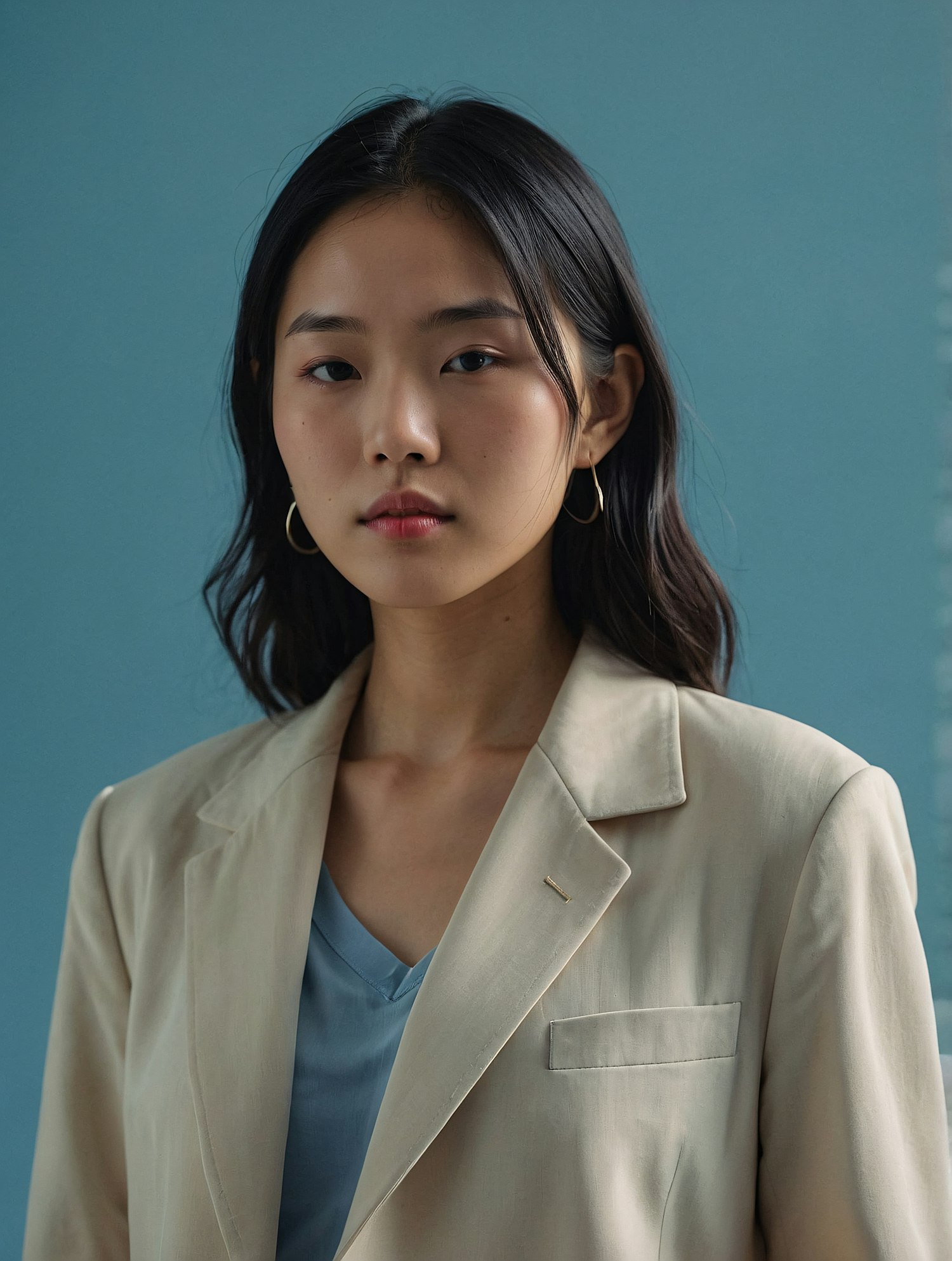 Young Asian woman with long black hair, wearing a beige blazer and gold hoop earrings, posing against a teal background.