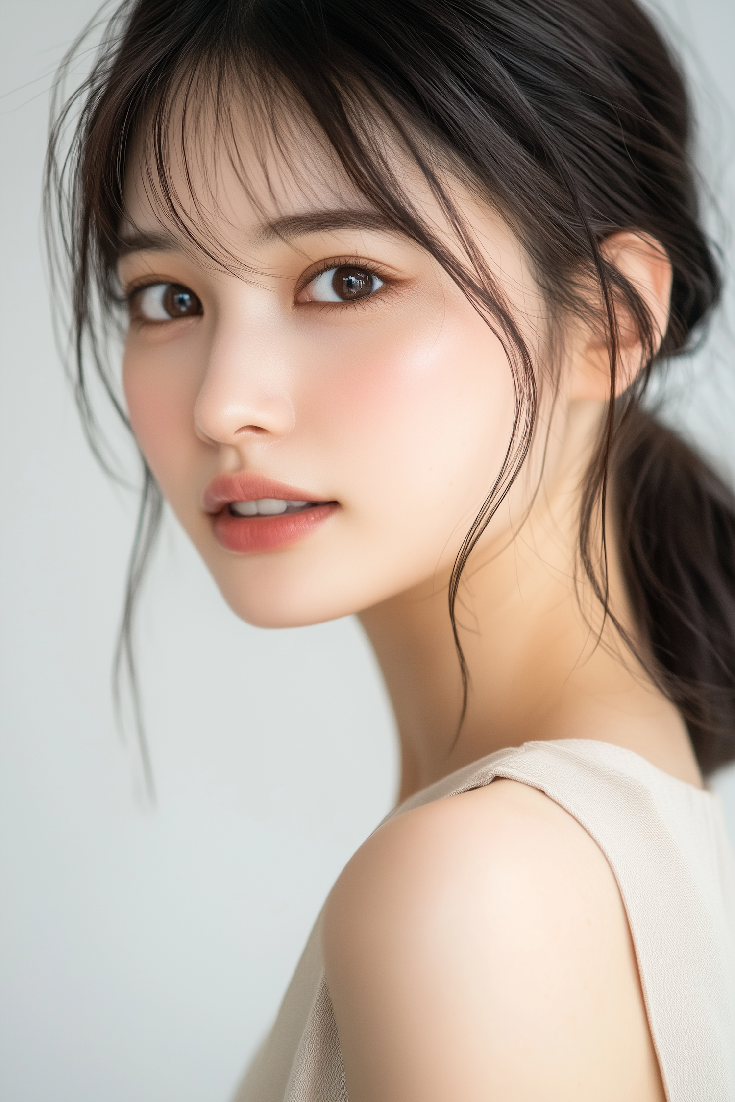 Close-up of a young woman with soft makeup, brown eyes, and loose dark hair, wearing a beige top against a neutral background.