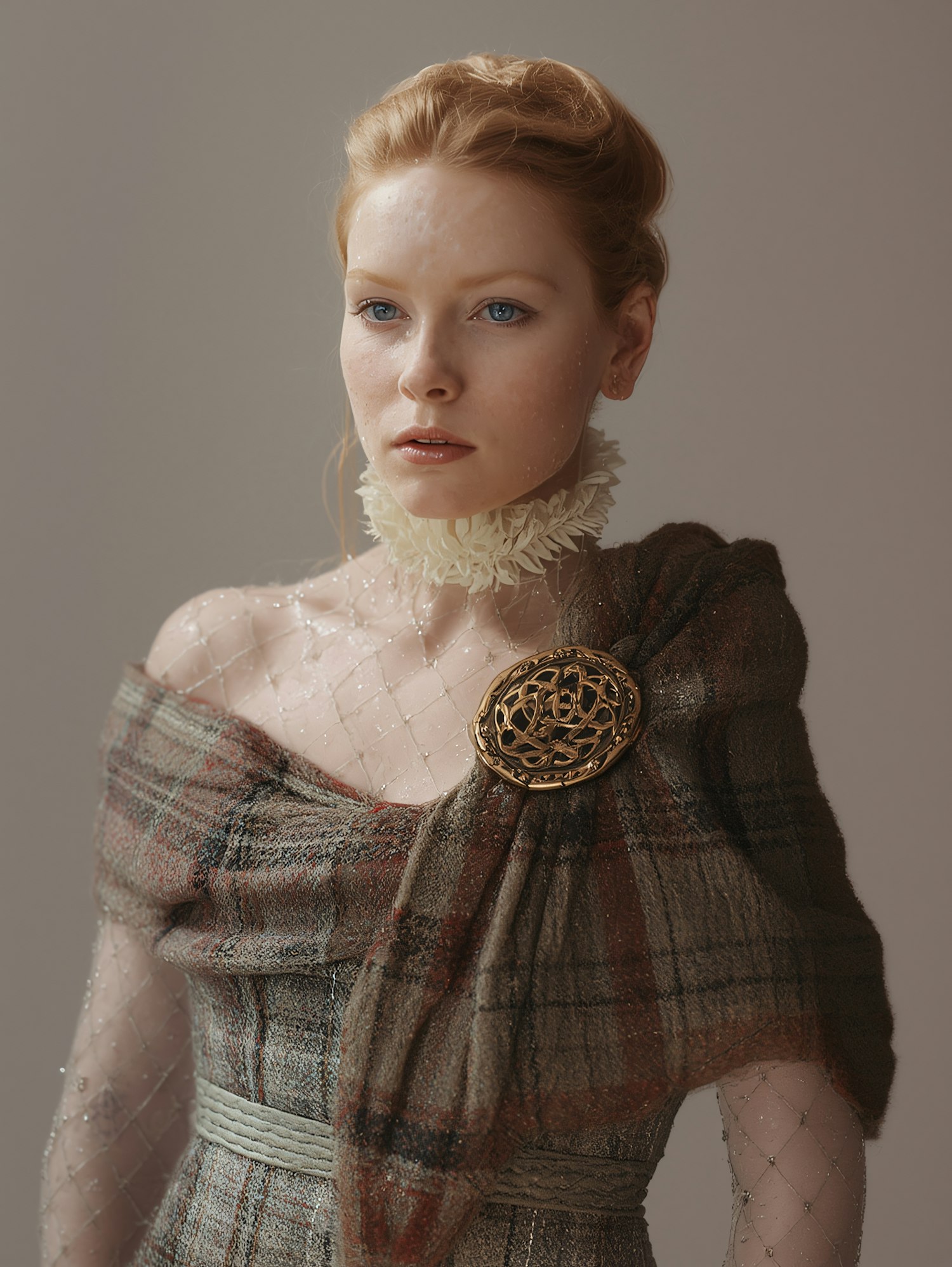 A woman with fair skin and strawberry blonde hair wears a plaid outfit with a golden brooch and a floral collar, exuding timeless elegance.