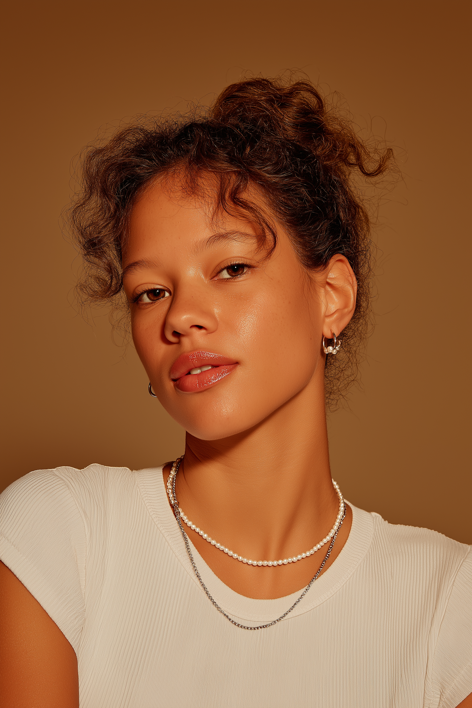 A portrait of a person with curly hair, wearing a white top and layered necklaces, set against a warm-toned background.