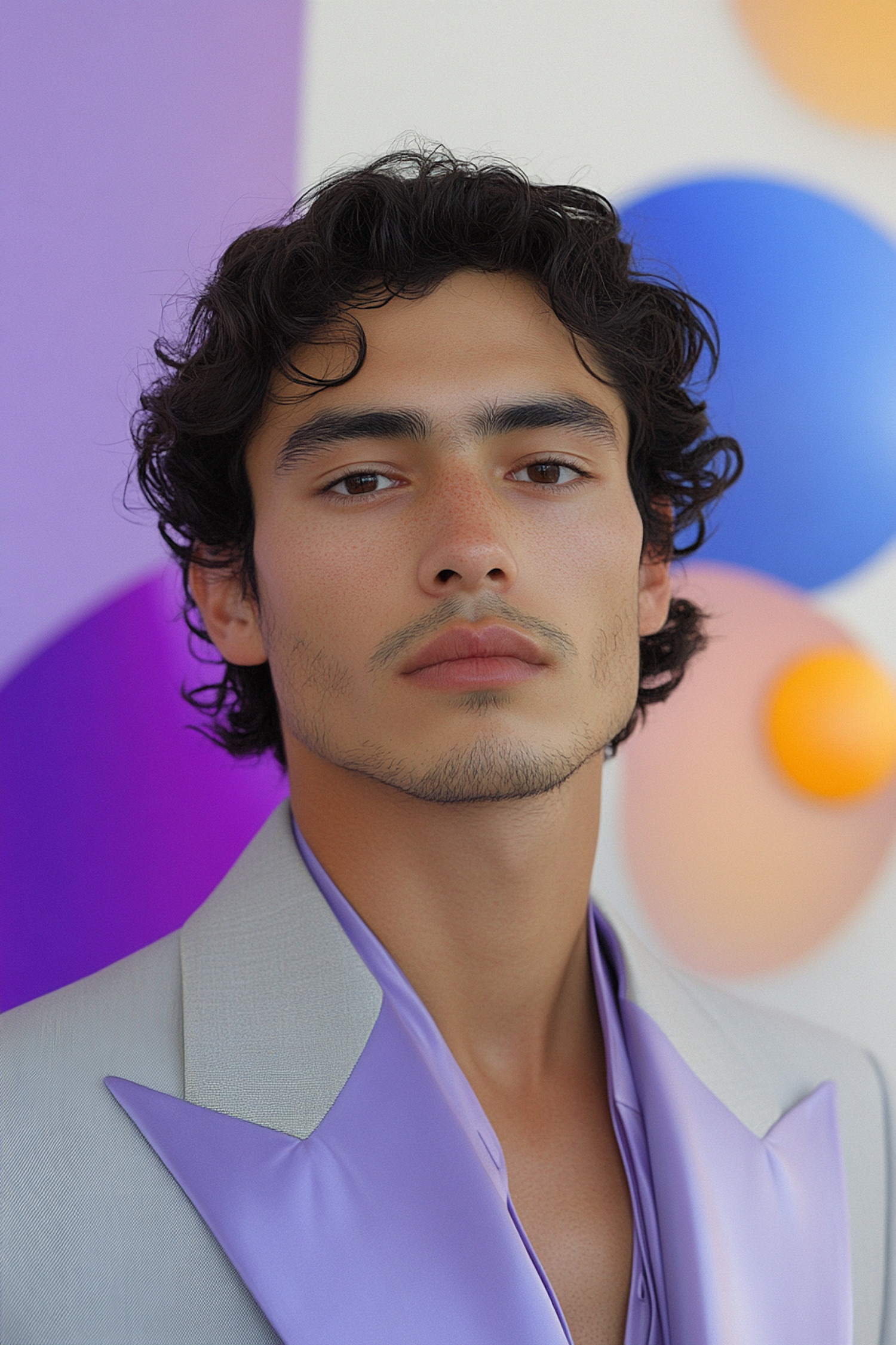 Stylish young man in a lavender shirt and gray suit, set against a colorful abstract background with purple, blue, and orange tones.