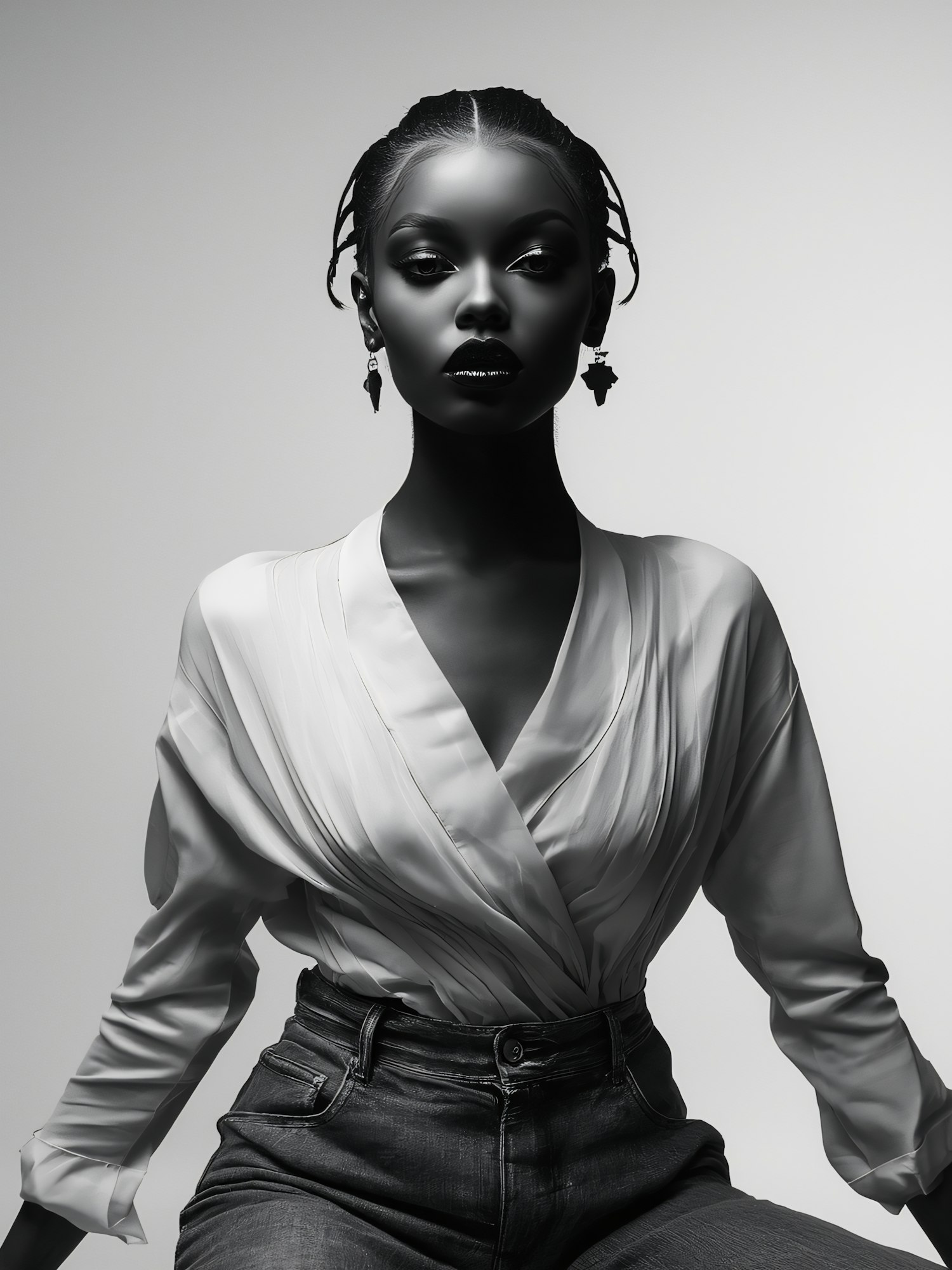 Black-and-white portrait of a woman in a white blouse and jeans, with braided hair and statement earrings, exuding elegance and confidence.