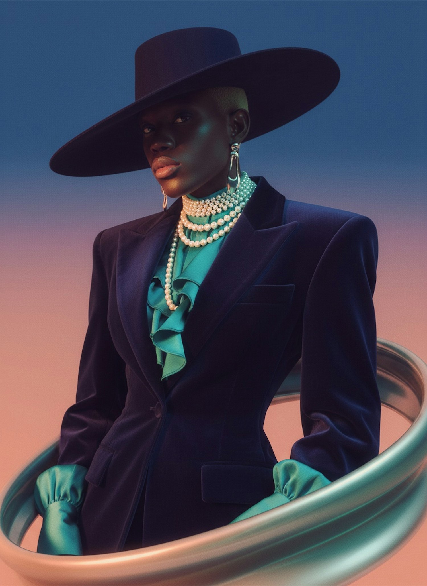 Elegant portrait of a person in a navy blazer, teal blouse, and black hat, accessorized with pearls, set against a gradient background.