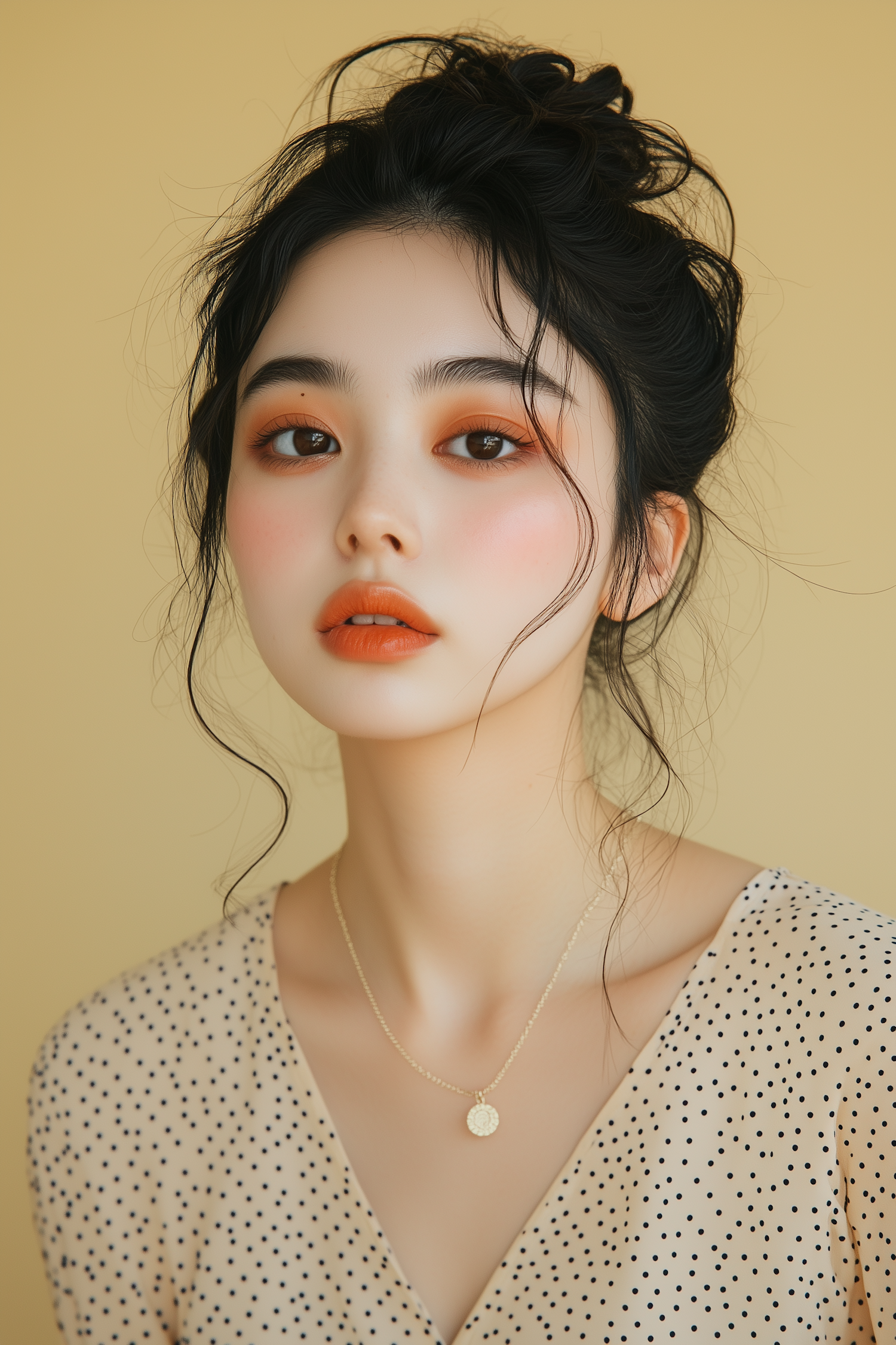 Elegant portrait of a young woman with natural makeup, polka dot blouse, and gold necklace against a muted yellow background.