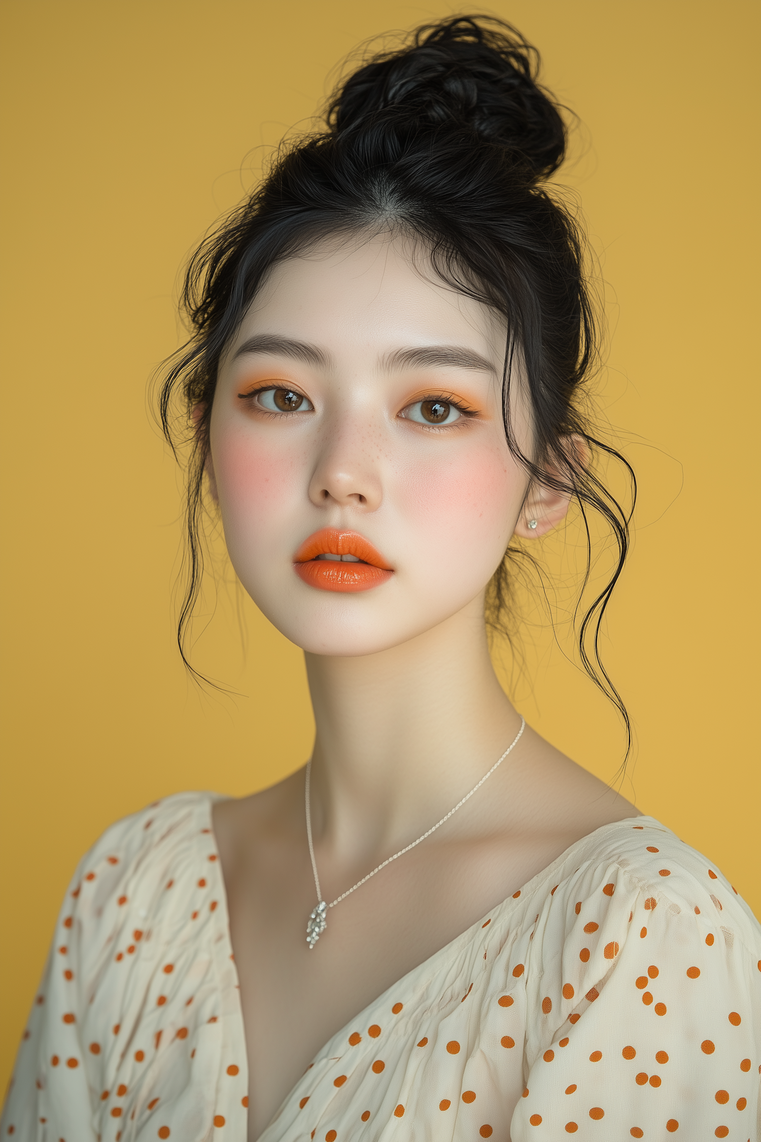 Portrait of a young woman with orange makeup, polka dot blouse, and a yellow background. Vibrant and stylish aesthetic.