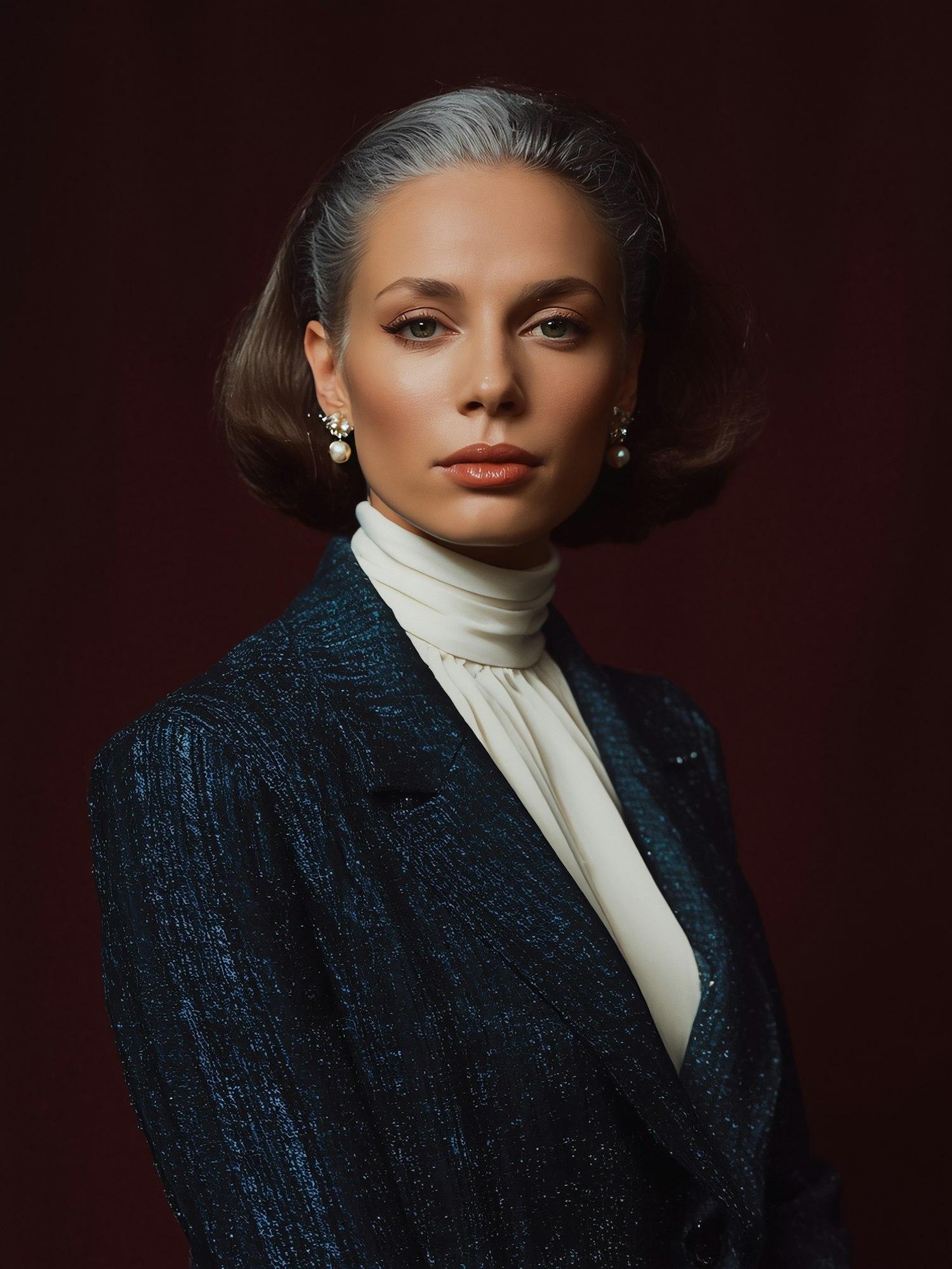 A confident individual in a formal outfit with pearl earrings, styled hair, and a composed expression against a deep-colored background.
