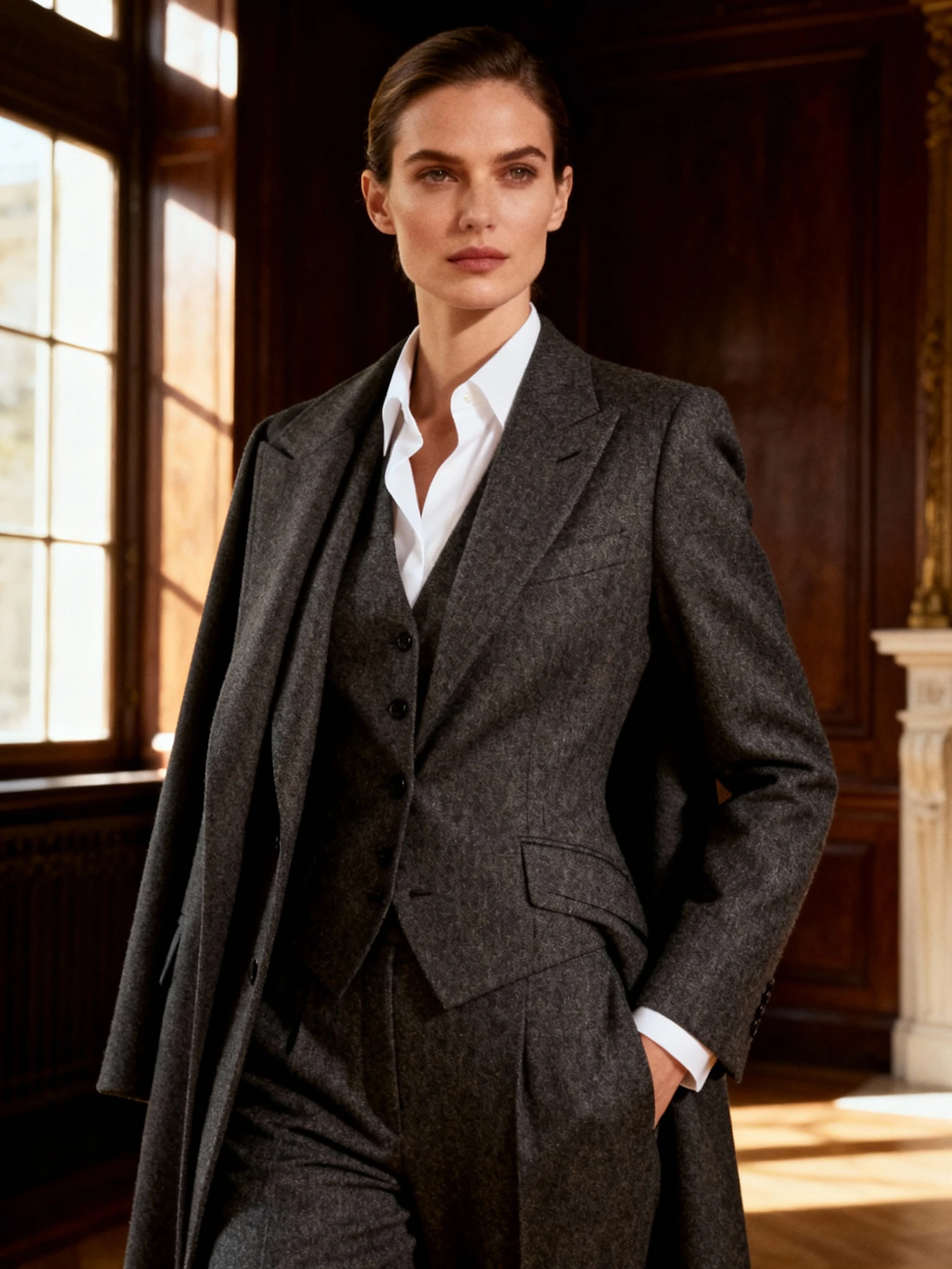 Cinematic fashion portrait of a female model standing in a dark, refined European interior with wooden panels and soft window light. He wears a charcoal wool suit with a crisp white shirt and tailored coat draped over his shoulders. Strong pose, calm expression, slight cinematic grain. Warm brown and muted gold tones create an editorial luxury atmosphere. Inspired by Ralph Lauren Purple Label and Giorgio Armani campaign photography, 8K ultra detail.