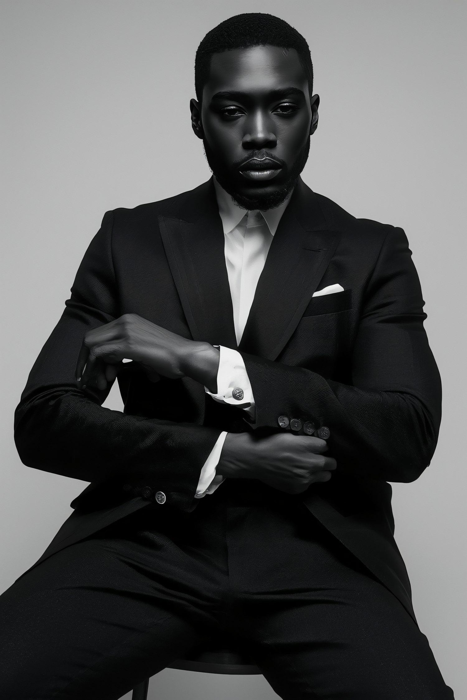 A man in a sharp black suit and white shirt sits confidently, exuding elegance and professionalism against a neutral backdrop.