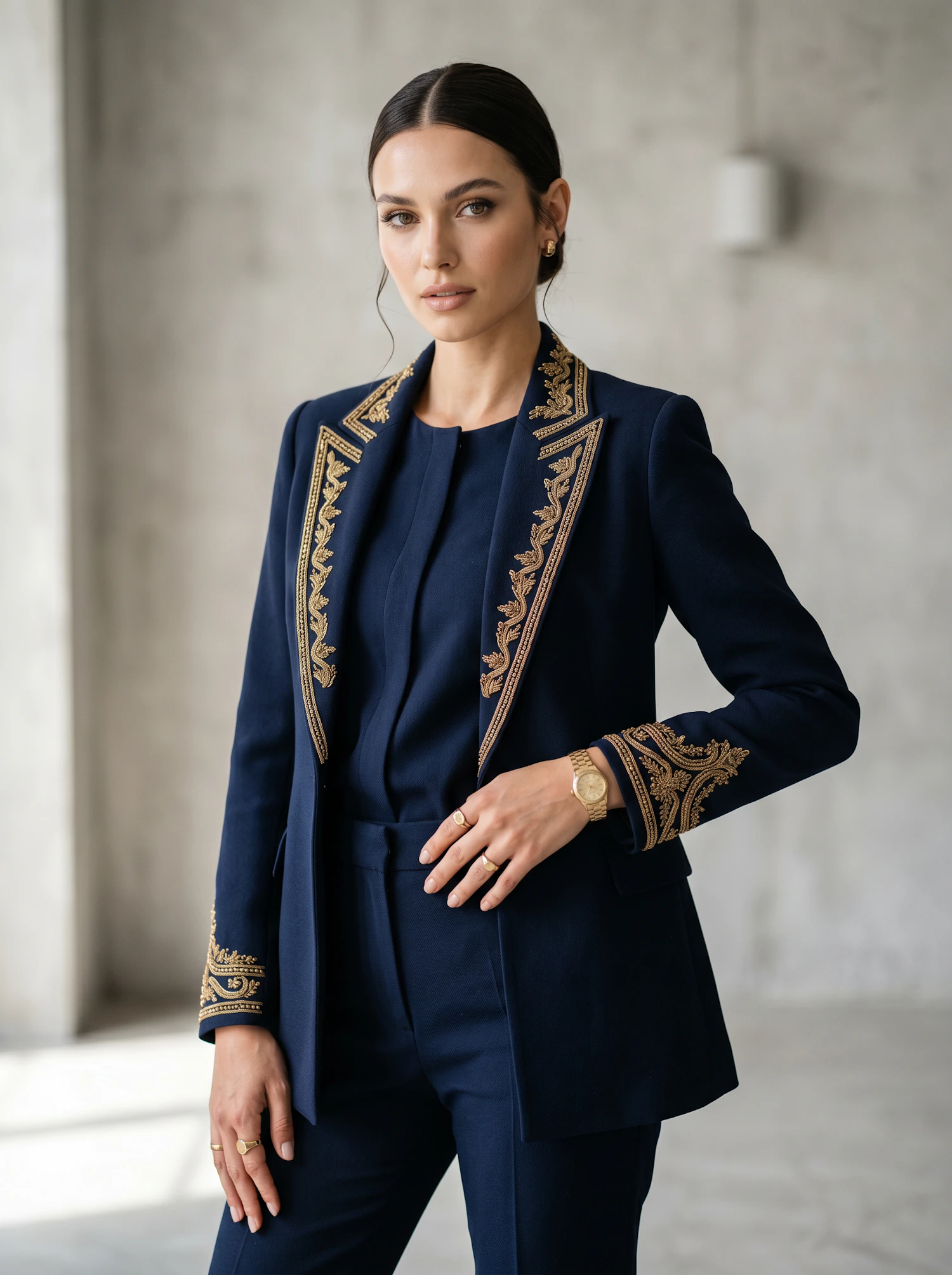 A poised woman in a navy blue suit with gold embroidery, accessorized with gold jewelry, standing in a minimalistic indoor setting.