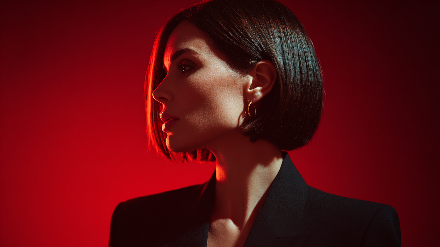 A striking profile of a woman with a sleek bob haircut, wearing a black blazer, set against a vibrant red background.