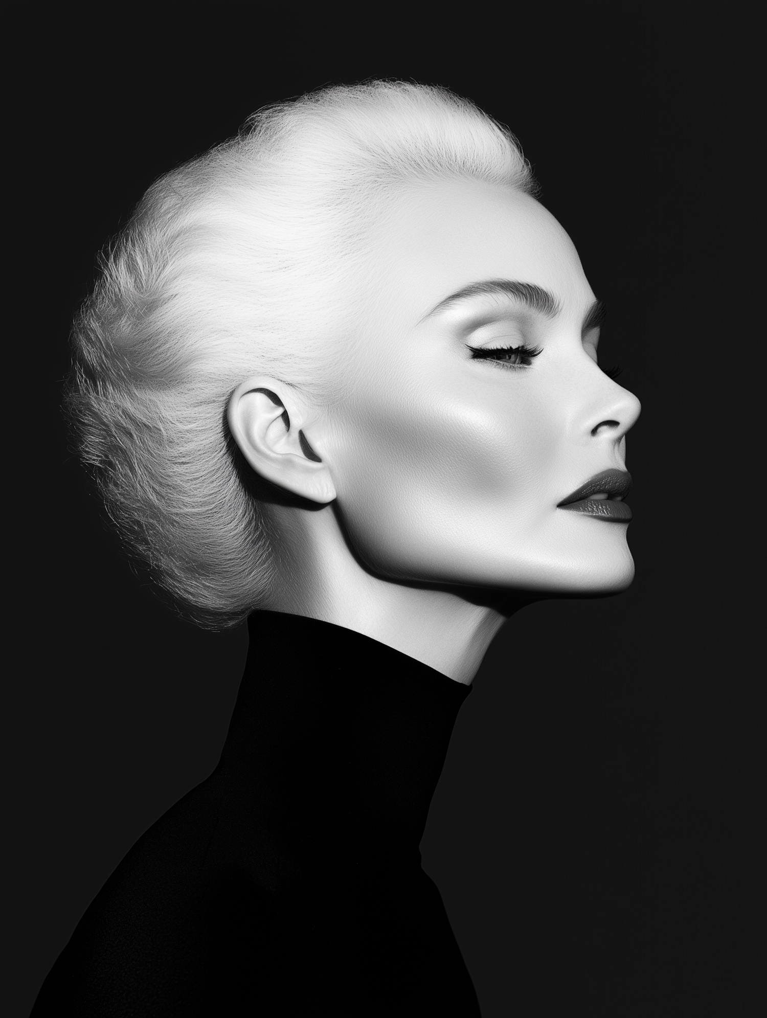 Elegant black and white portrait of a woman with a sleek updo and closed eyes, exuding calm and sophistication.