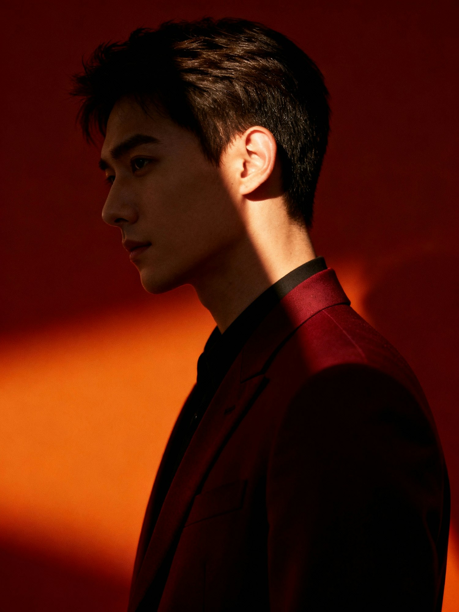 A dramatic portrait of a person in a red suit against a vibrant red background, with striking lighting and shadows.