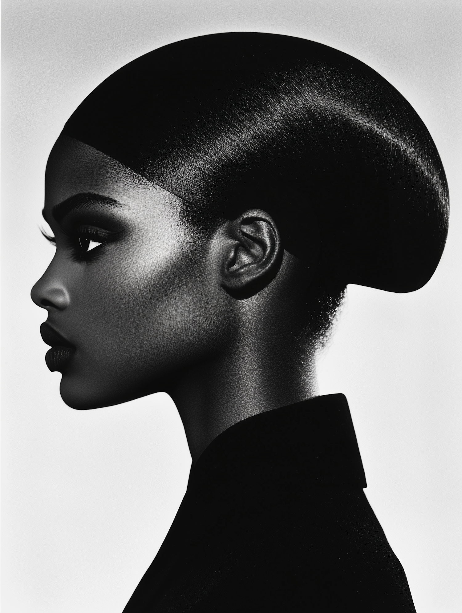 Elegant black and white profile portrait of a woman with sleek hair in a bun, highlighting her striking features and sophisticated style.