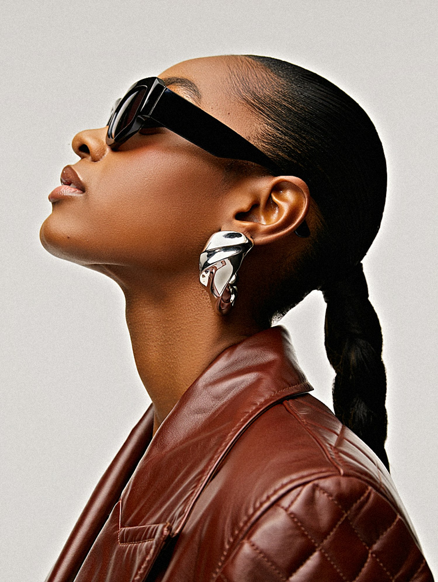 Chic profile of a woman in a quilted leather jacket, sleek braid, bold sunglasses, and sculptural silver earrings against a neutral backdrop.