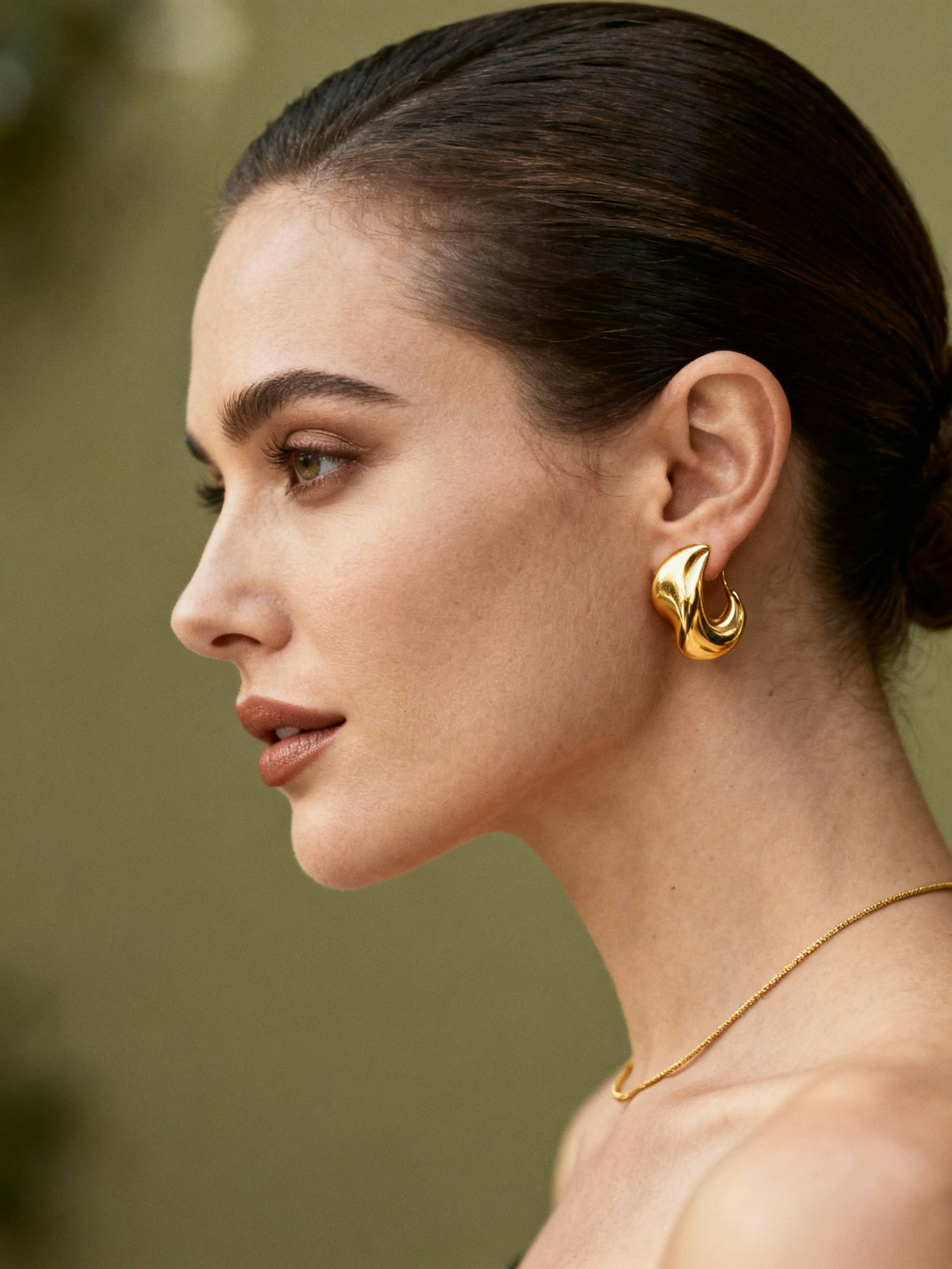 Elegant profile of a woman with gold jewelry, sleek bun, and natural makeup against a soft green background.