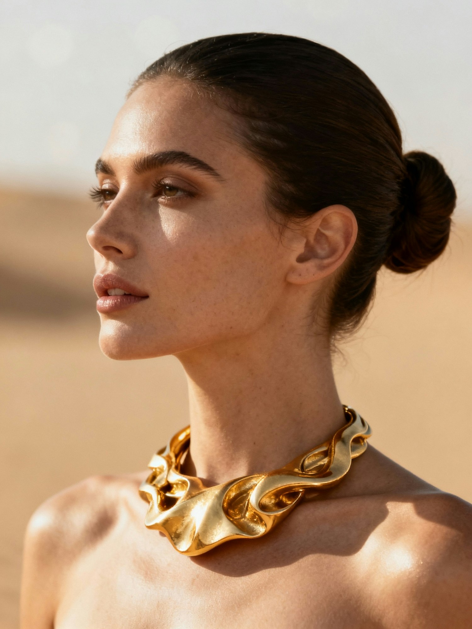 editorial jewelry photography, fine jewelry, minimalistic composition, soft natural light, high-end luxury aesthetic, shallow depth of field, neutral clean backdrop, warm and muted tones, cinematic shadows, ultra-realistic details — upper body portrait of a woman with bare shoulders wearing a bold sculptural gold necklace, hair in a sleek bun, soft golden sunlight from the side, blurred pale desert tan background, focus on necklace shape