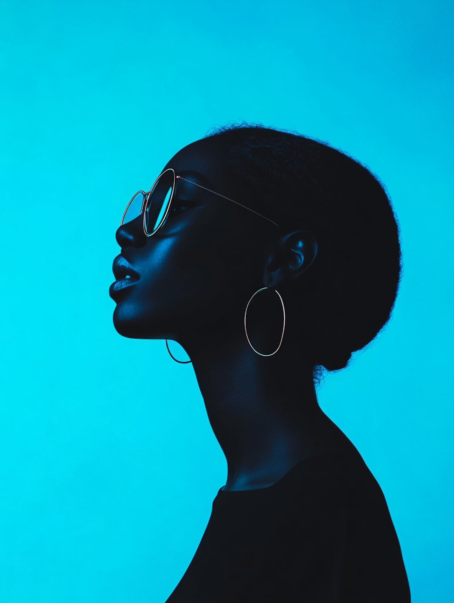 Profile portrait of a woman with hoop earrings and sunglasses, set against a vibrant blue background with dramatic lighting.