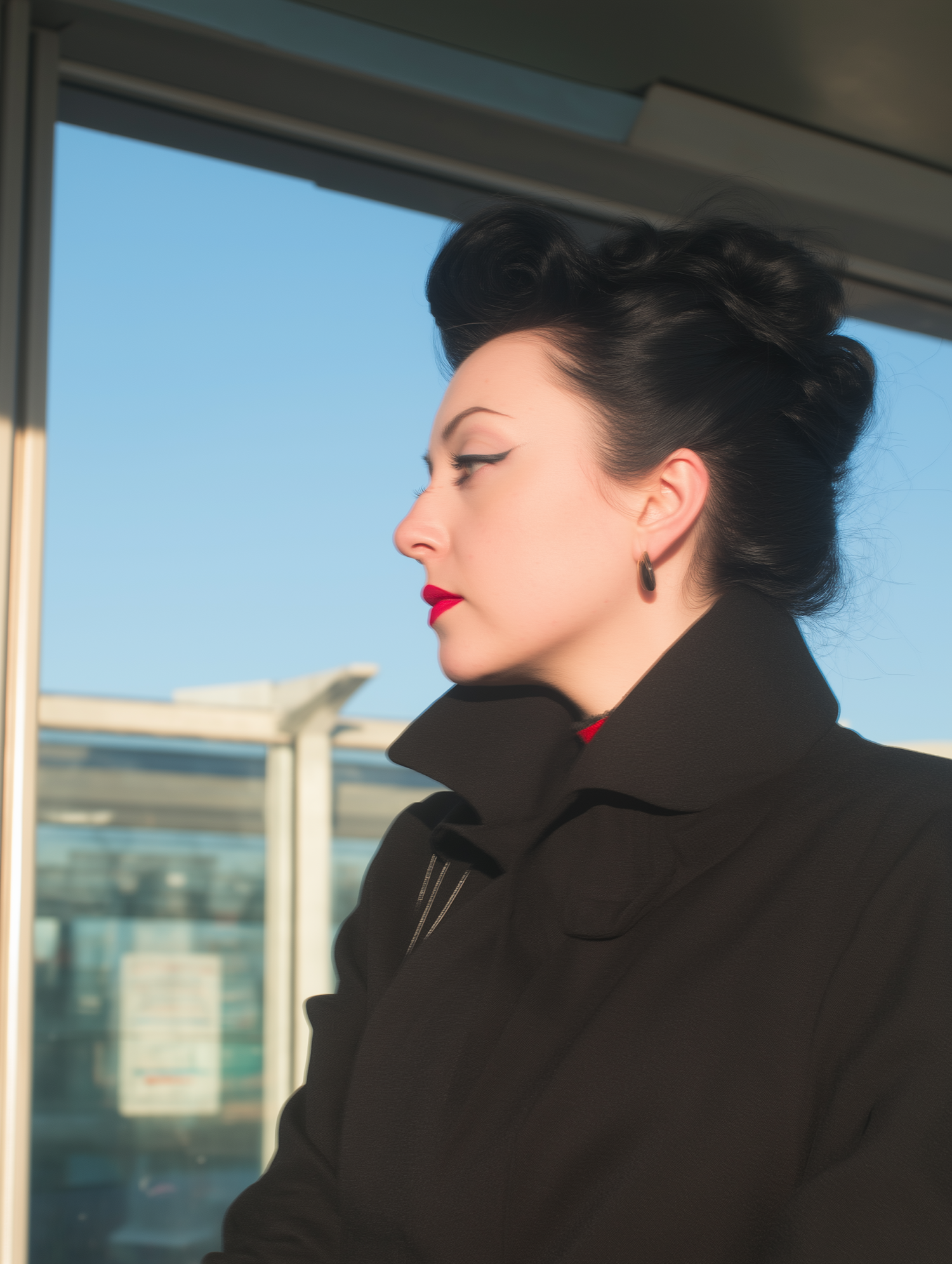 A stylish woman in a black coat with bold makeup and an elegant updo, set against a modern architectural background on a sunny day.