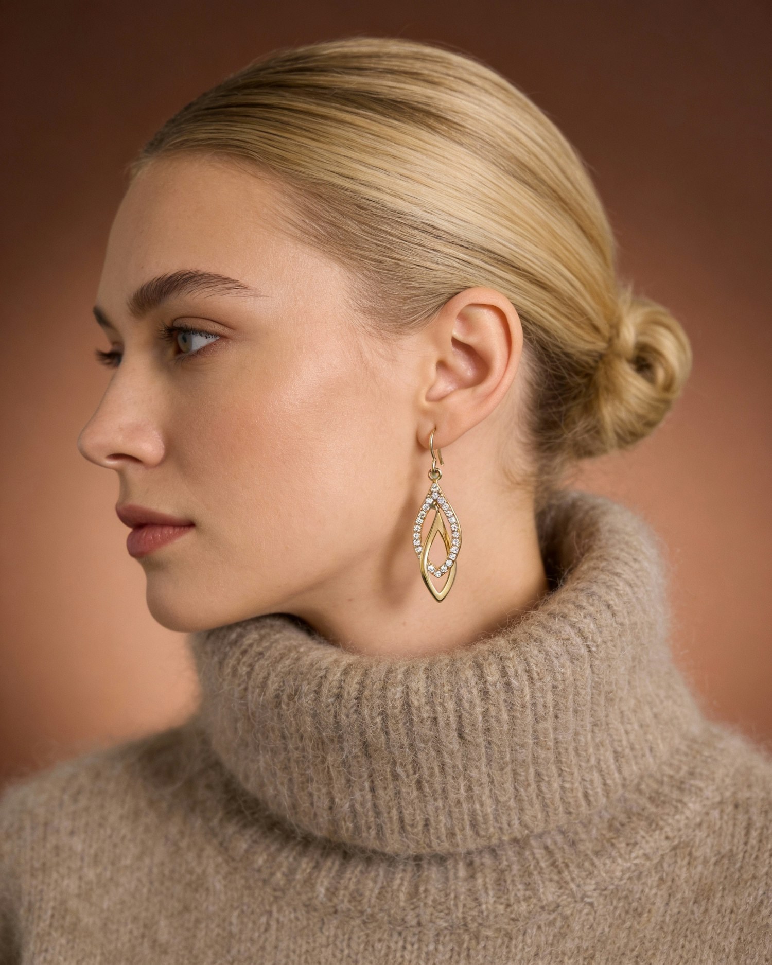 Side profile of a woman with blonde hair in a bun, wearing a beige sweater and gold teardrop earrings with gemstones.