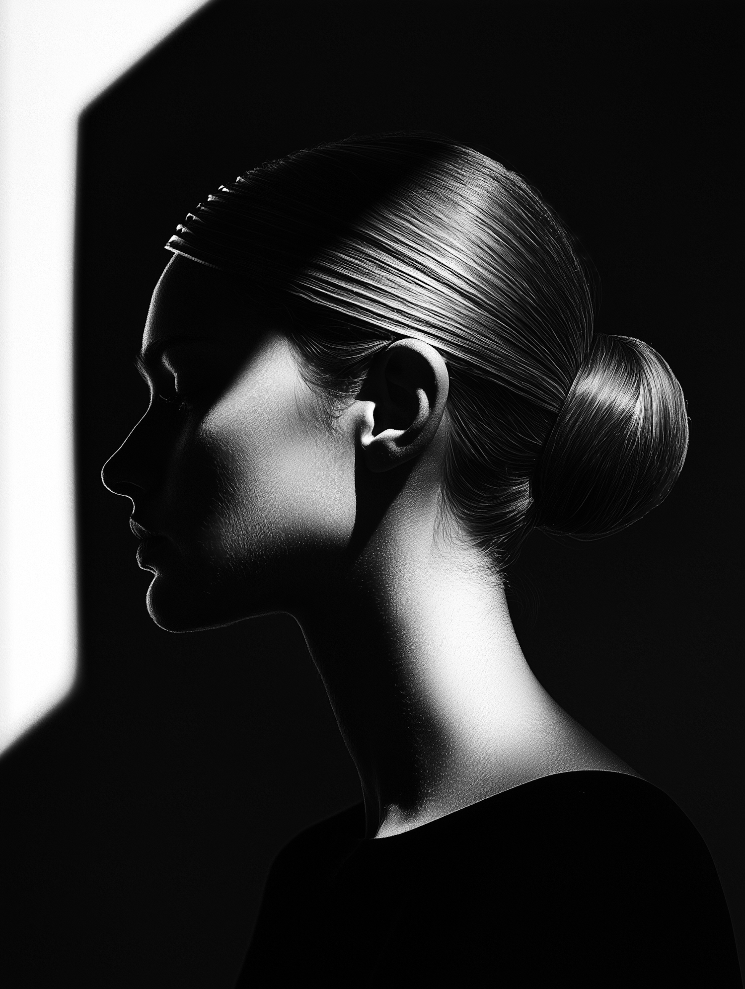 Minimalist black-and-white profile portrait of a woman with sleek hair in a bun, dramatic lighting, and geometric background contrast.