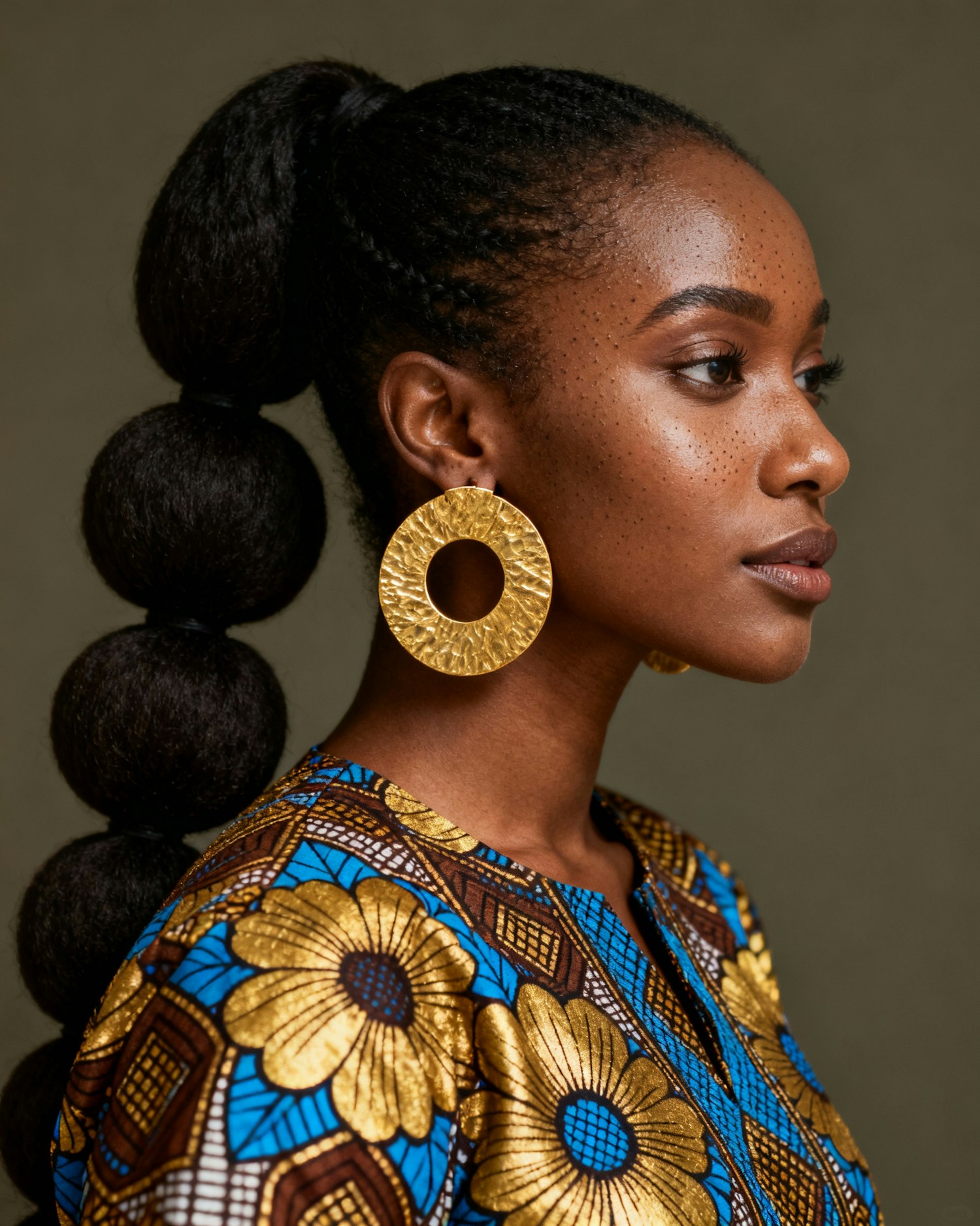 Generate a hyper-realistic profile portrait of a dark-skinned woman with intricately styled hair pulled into a segmented ponytail of large, rounded sections. Her skin should appear luminous and detailed, with visible texture, pores, and tonal depth—highlighting the richness and beauty of her complexion. She wears large, circular gold earrings with a textured surface and a bold, patterned garment featuring gold, blue, and brown tones in stylised floral and geometric designs. Use soft, directional lighting to accentuate facial contours and skin texture. The background should be plain and complementary—such as warm taupe or deep slate—to enhance skin tone harmony and visual clarity. The overall aesthetic should evoke cultural pride, elegance, and editorial sophistication.