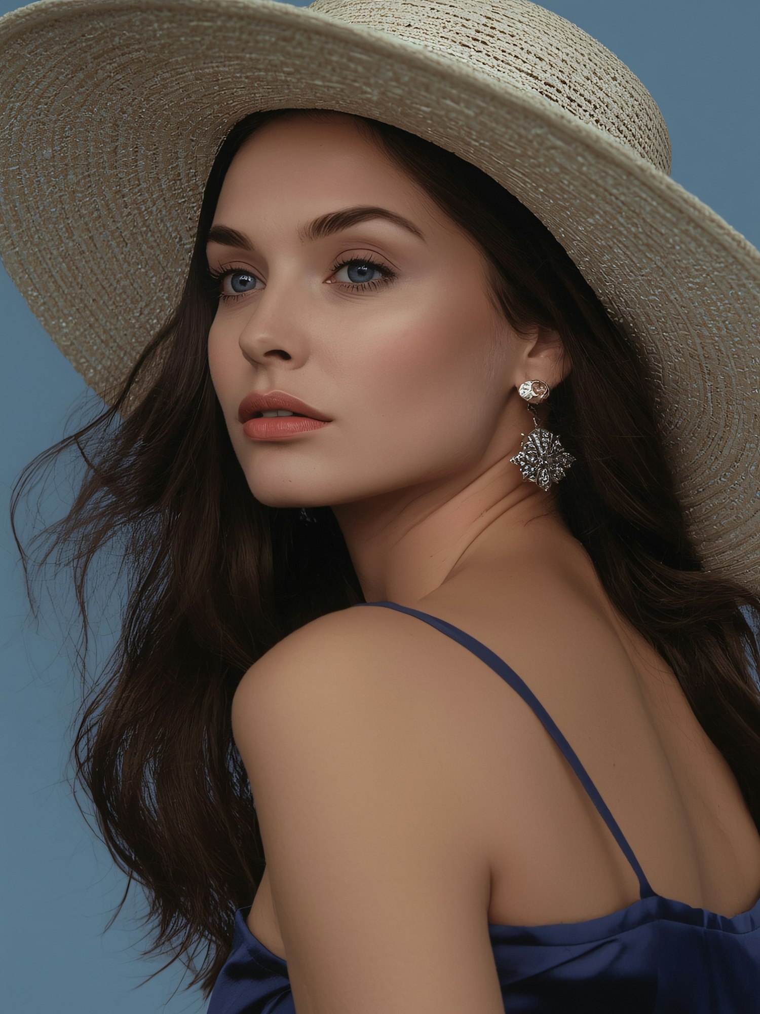 A woman in a straw hat and blue satin top, with silver earrings, poses against a light blue background, showcasing elegance and style.