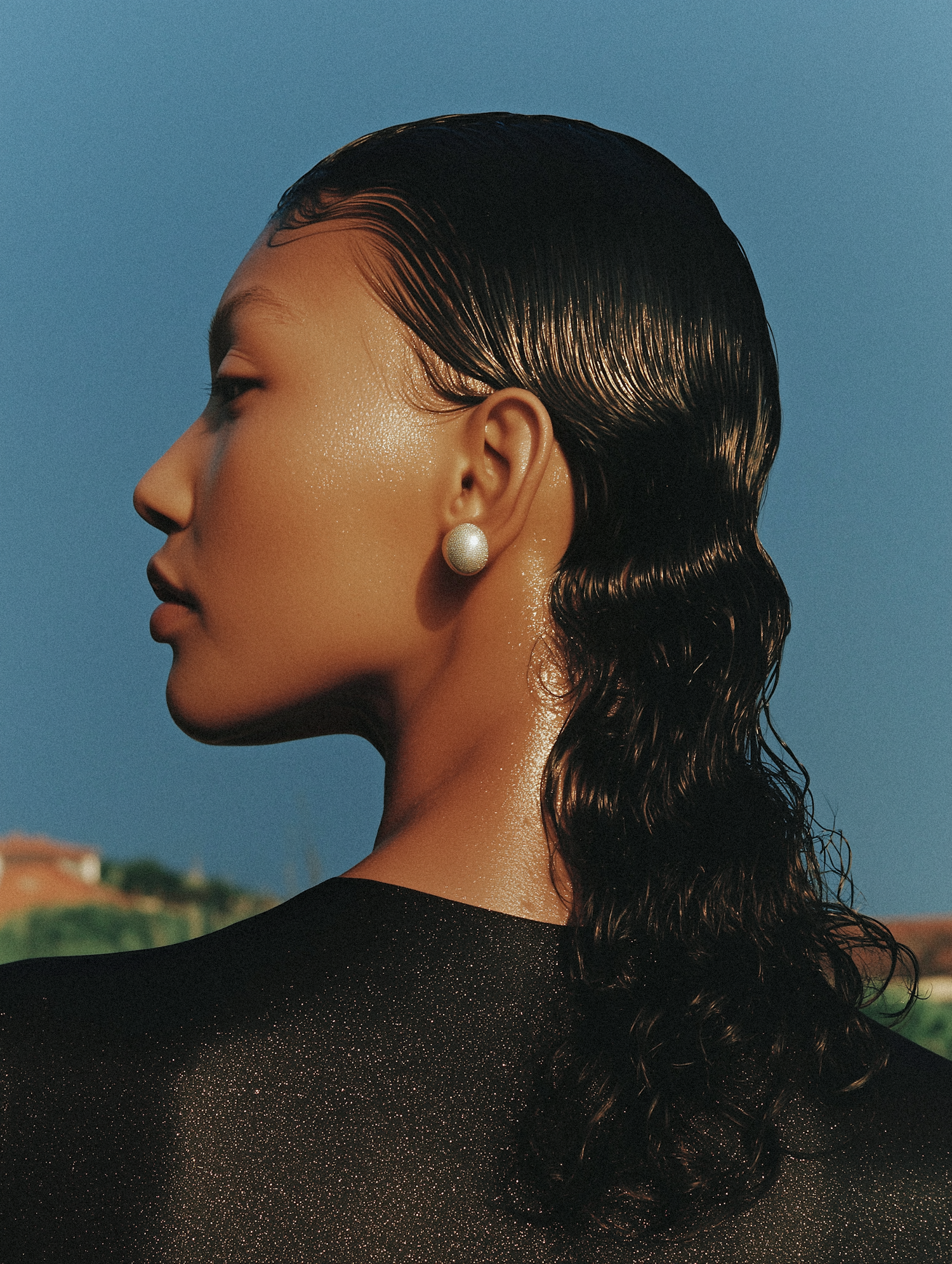 Profile view of a person with sleek hair, a shimmering black top, and a bold earring, set against a serene blue background.