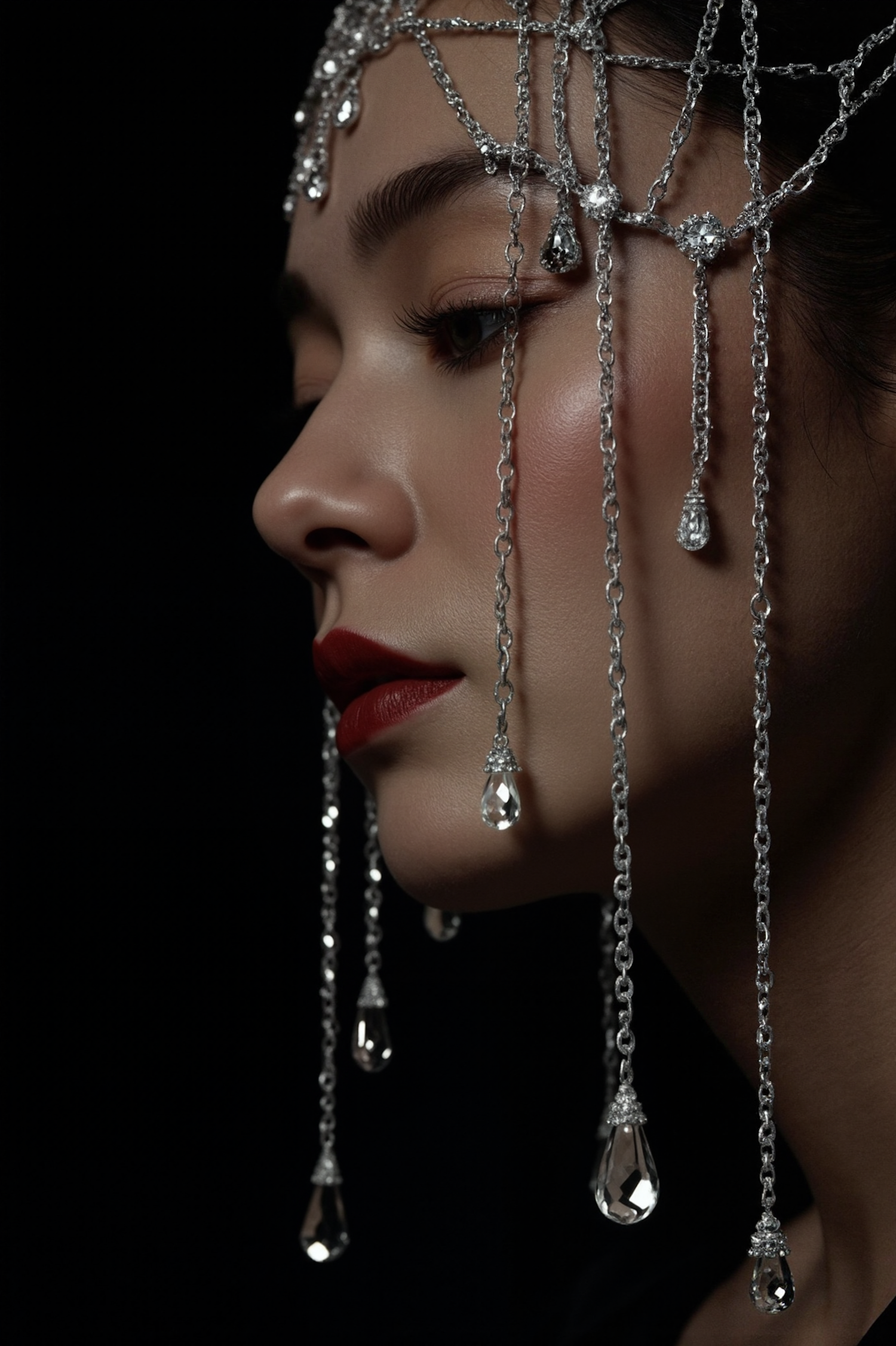 Elegant portrait of a woman with a silver headpiece and crystal droplets, featuring dramatic lighting and deep red lips.