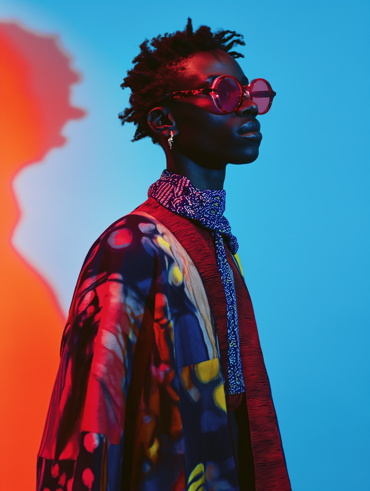 Bold portrait of a stylish individual in vibrant patterns, red sunglasses, and a gradient blue-orange background.