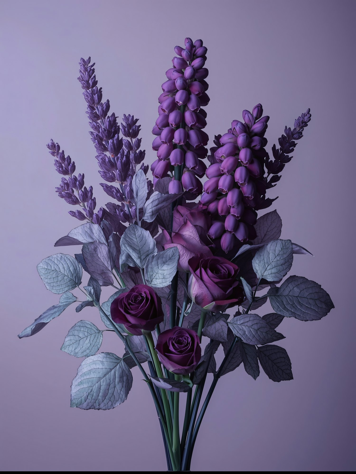 A stunning bouquet of purple roses and lavender blooms with muted green leaves, set against a soft purple background.