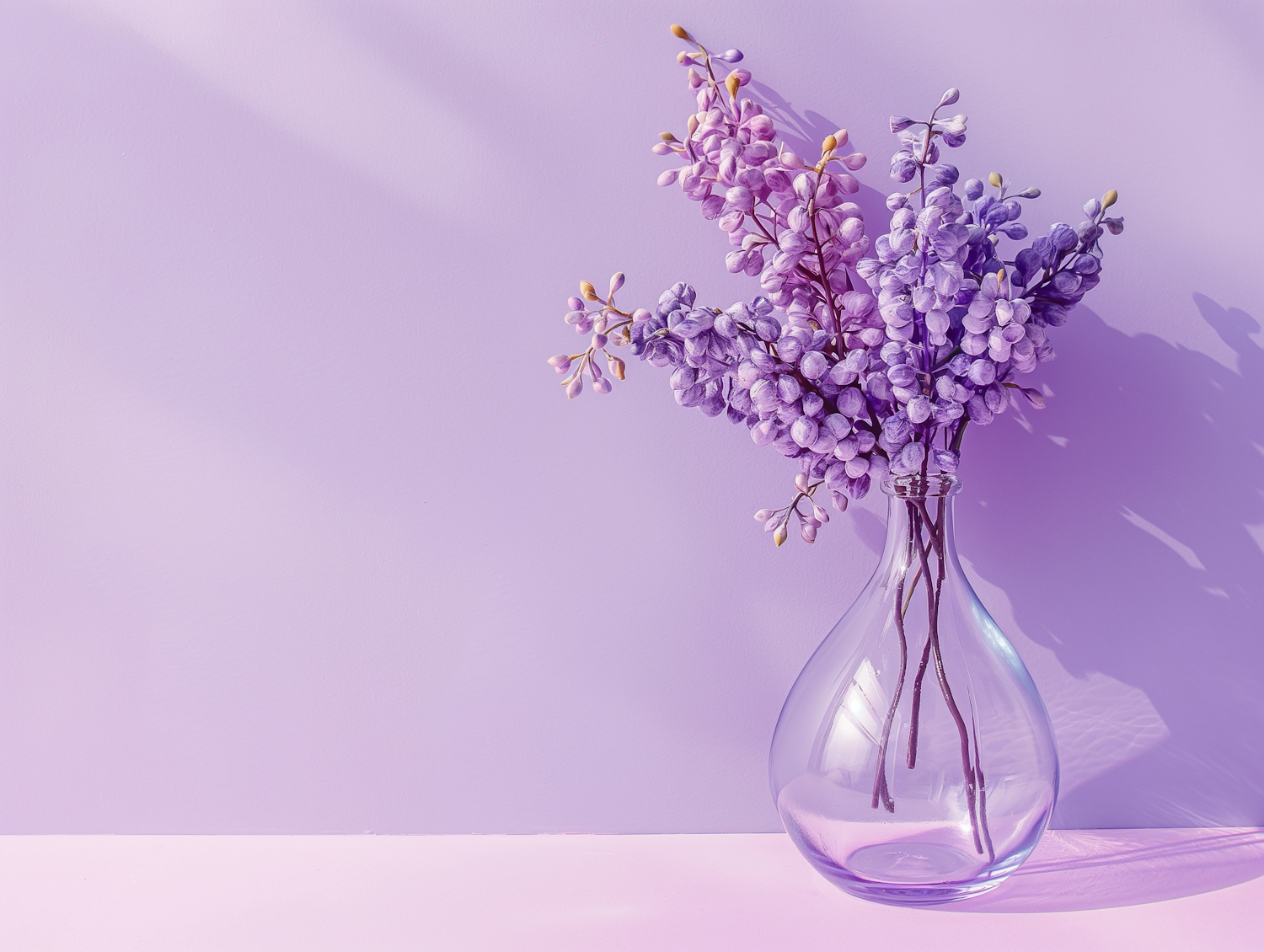 Elegant purple flowers in a clear vase against a lavender background, creating a serene and minimalistic aesthetic.