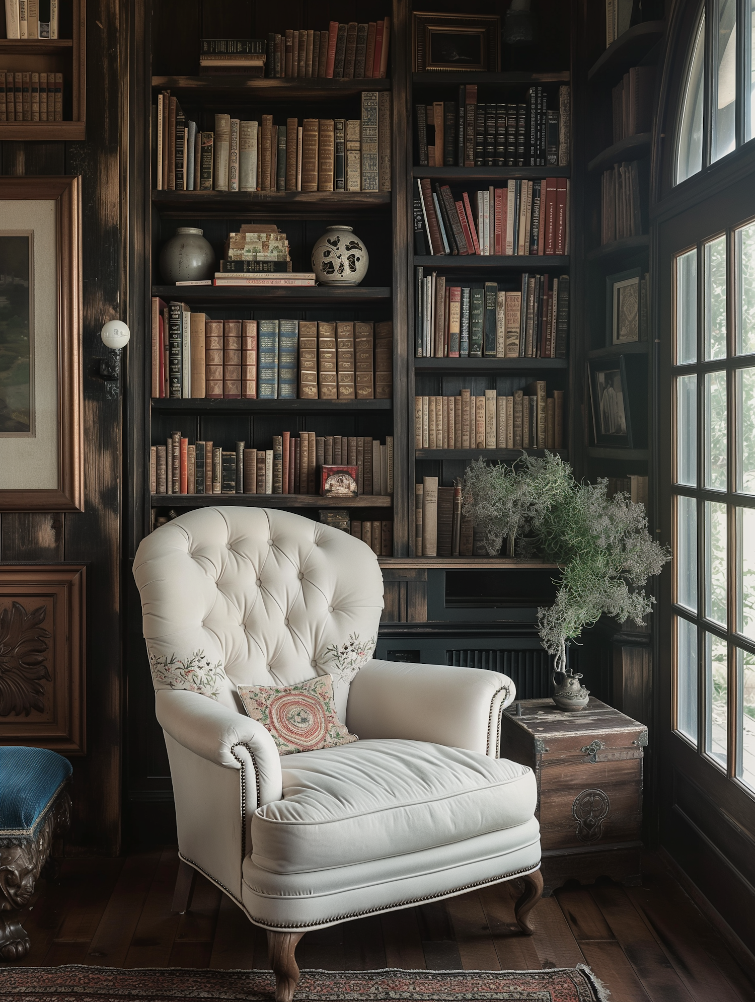 Elegant reading nook with a plush white armchair, surrounded by bookshelves and natural light, perfect for relaxation.