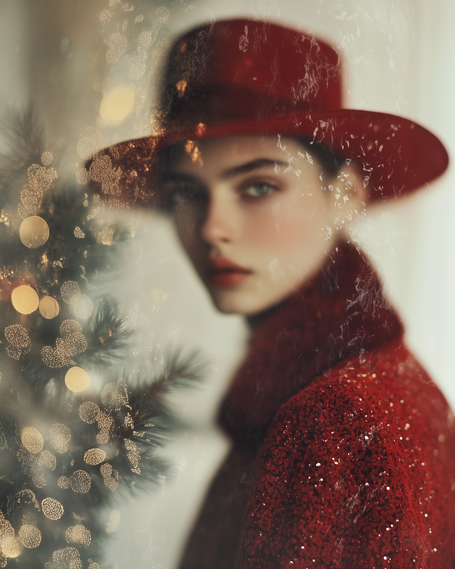 Elegant woman in red hat and sweater with Christmas tree lights, creating a festive and dreamy atmosphere.