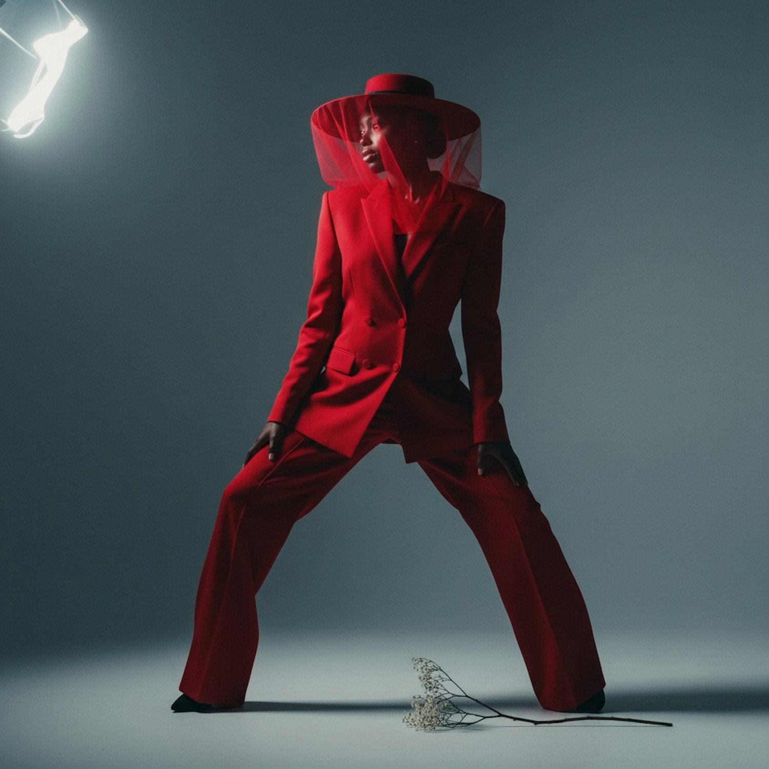 A striking fashion portrait of a person in a red suit and hat, posing dynamically with dramatic lighting and a minimalist background.